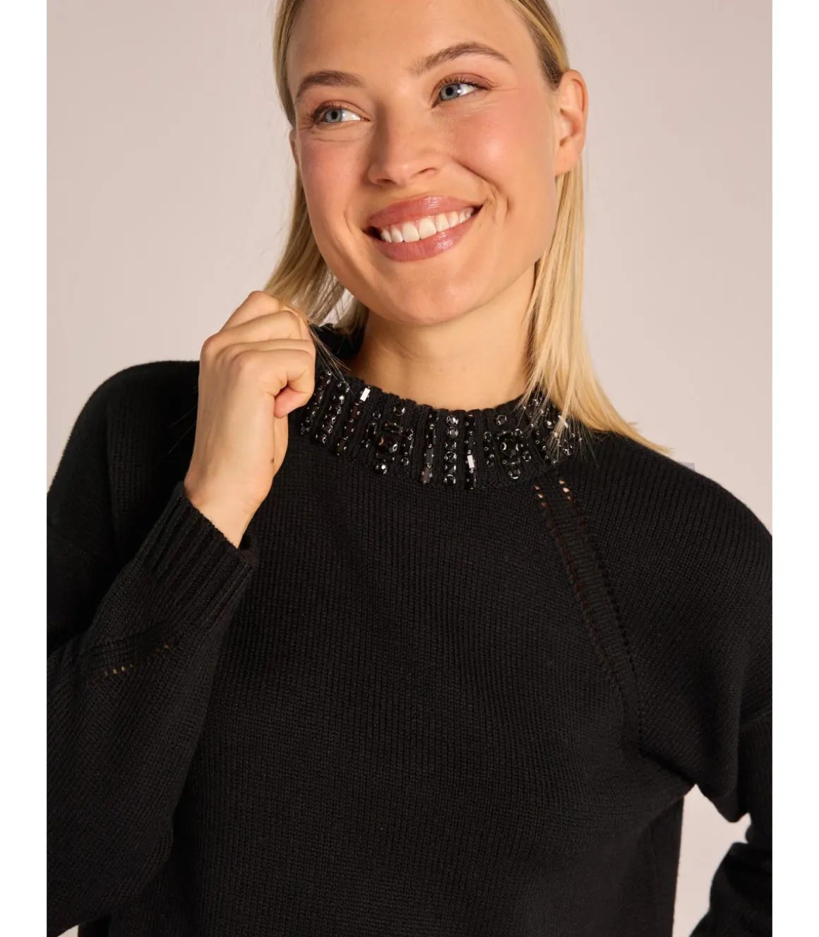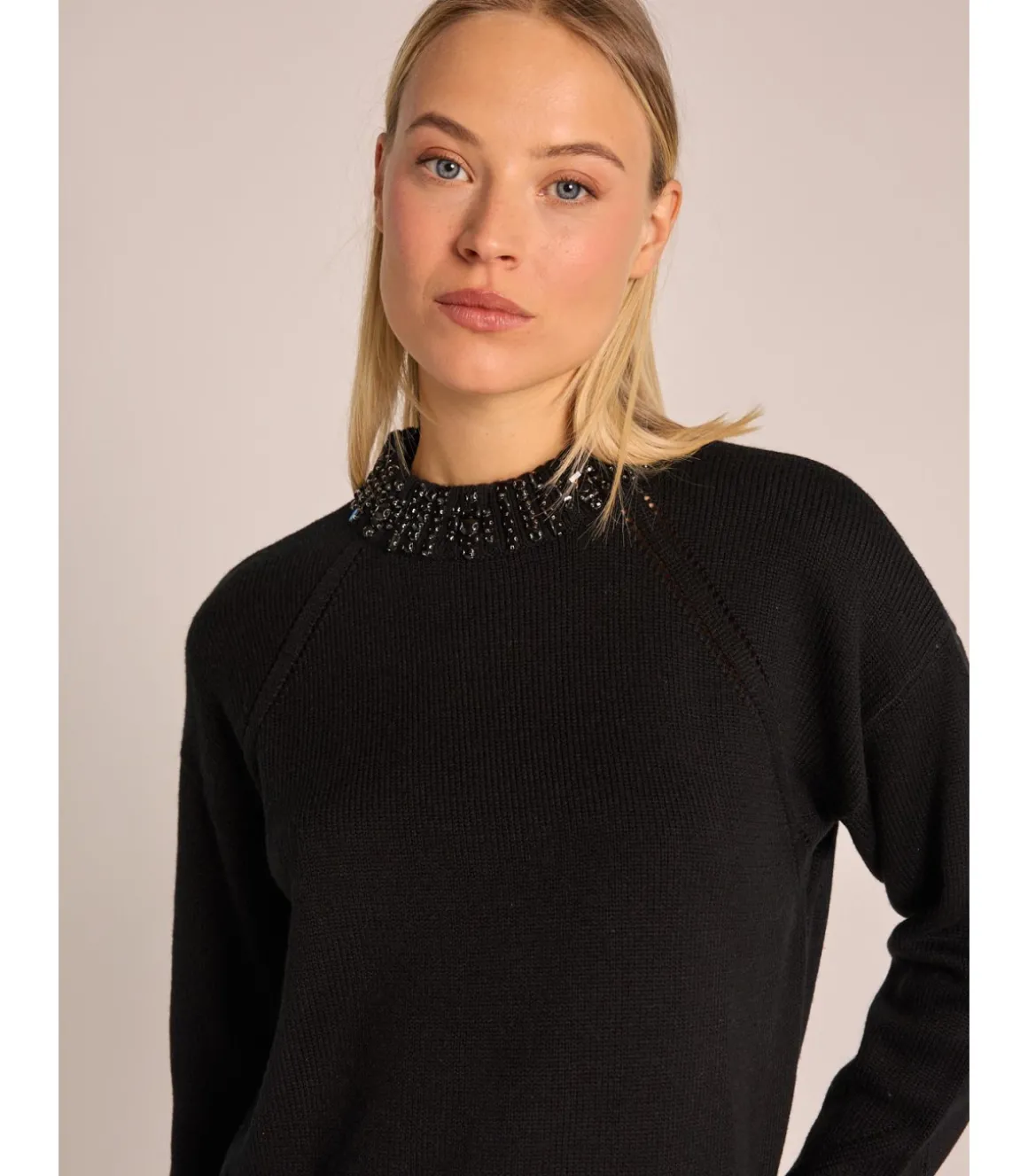 Jersey de lana de mujer con cuello de pedrería. Con manga larga y sin cierre. Las medidas de la modelo vistiendo la talla S son: altura 1,68cm, pecho 87cm, cintura 63cm y cadera 88cm.