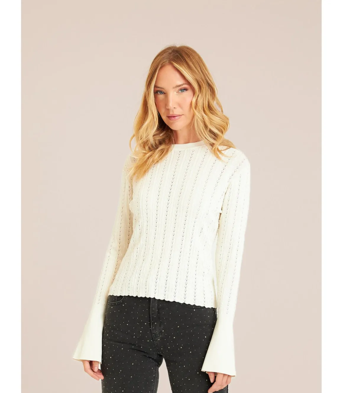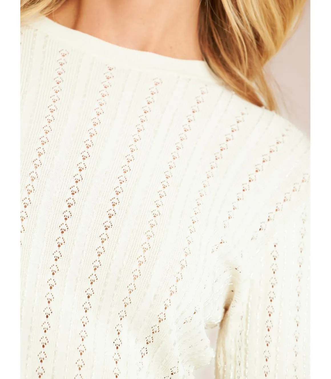 Jersey de punto con calados de mujer. Confeccionada en viscosa. Las medidas de la modelo vistiendo la talla S son: altura 1,68cm, pecho 87cm, cintura 63cm y cadera 88cm.