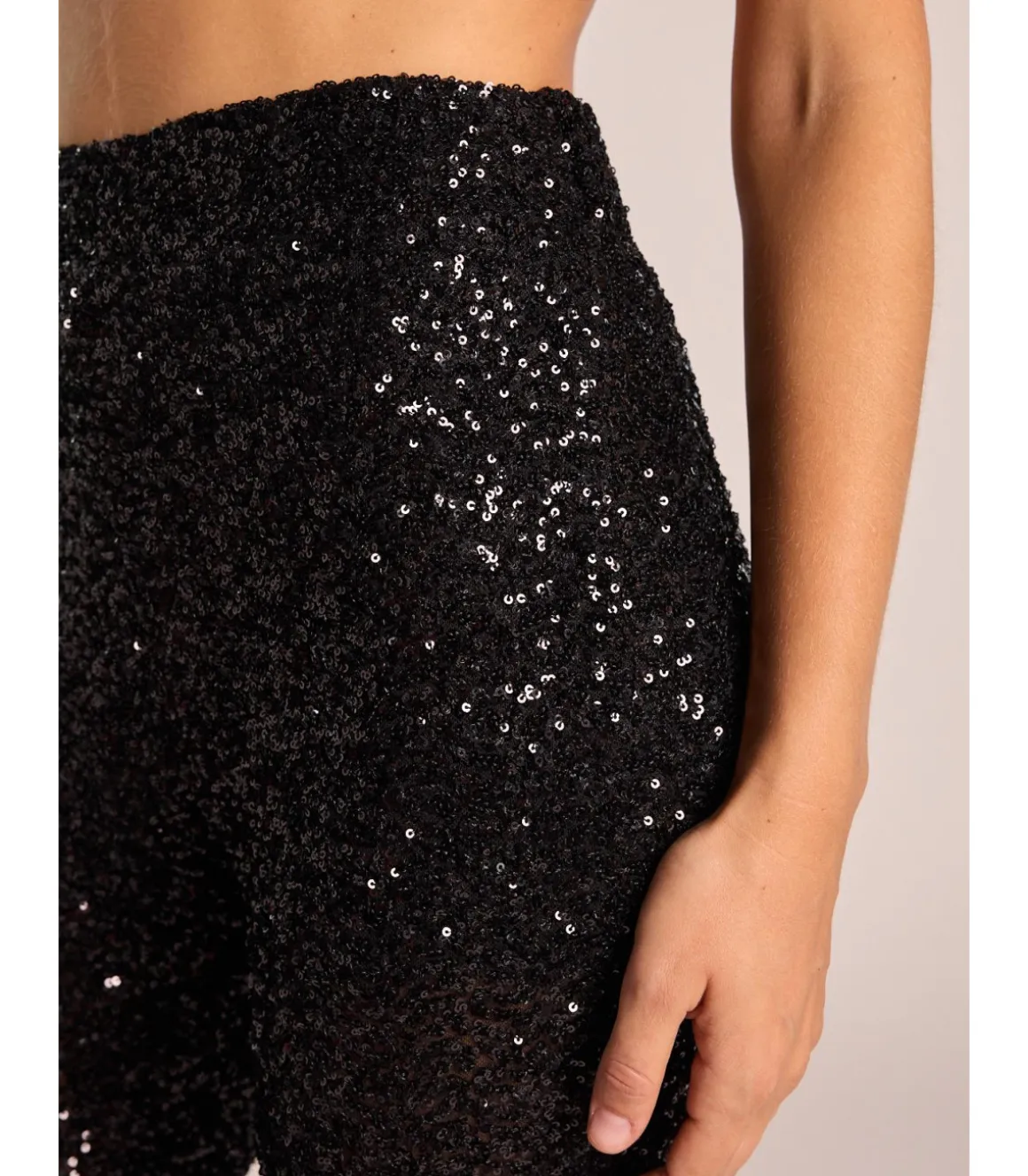 Pantalón largo de mujer cubierto con lentejuelas. Tiro alto sin cierre con cintura elástica. Medidas de la modelo: altura 1,69cm, pecho 82cm, cintura 60cm y cadera 88cm.