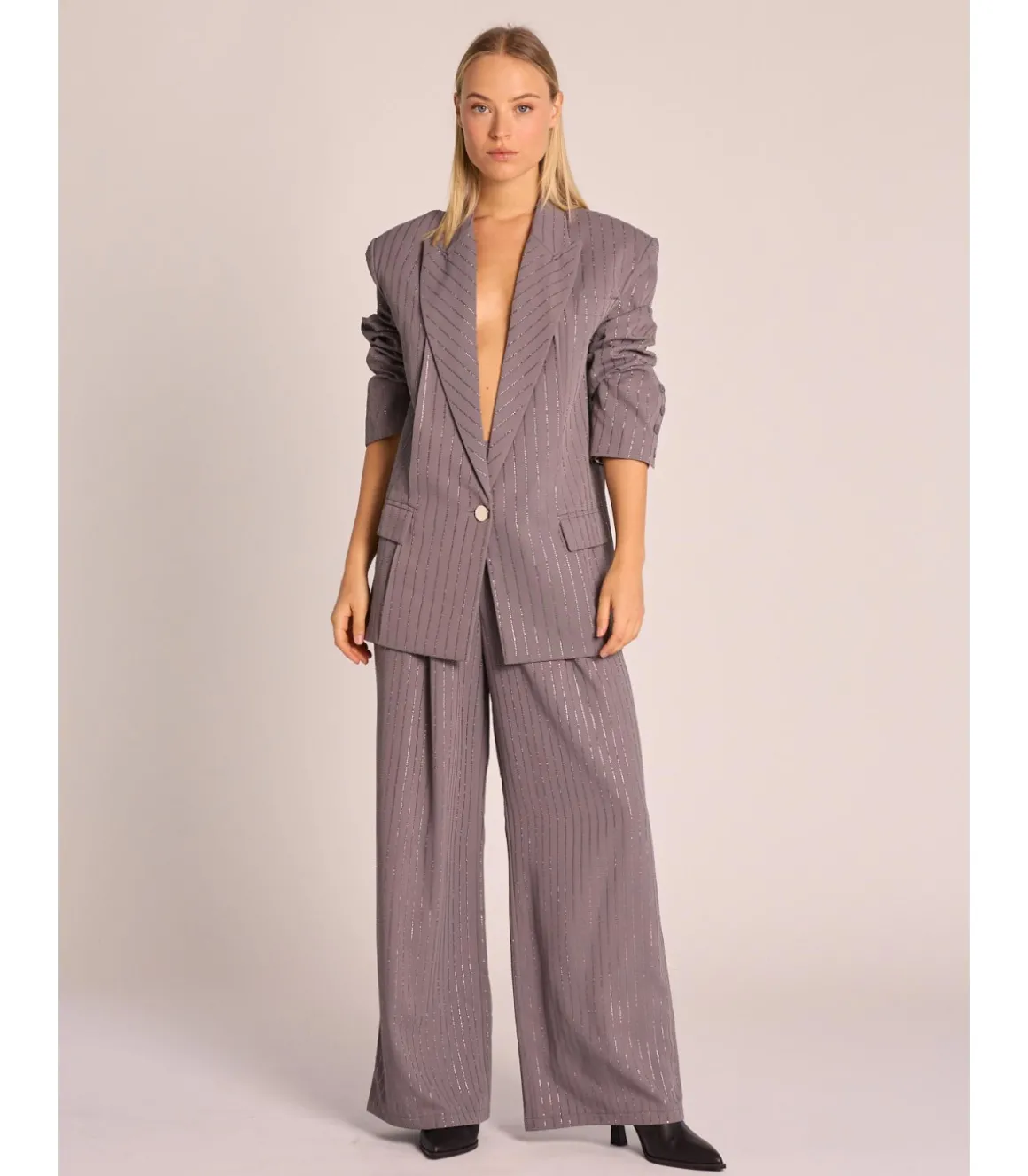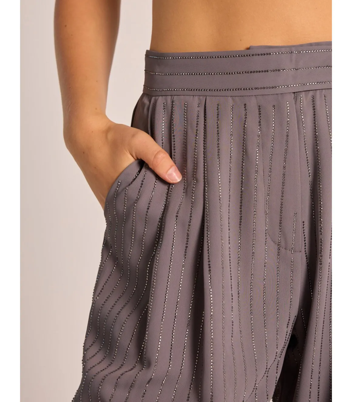 Pantalón confeccionado en un poliéster, con rayas de pedrería en vertical. Tiro alto con cierre de cremallera. Medidas de la modelo: altura 1,69cm, pecho 82cm, cintura 60cm y cadera 88cm.