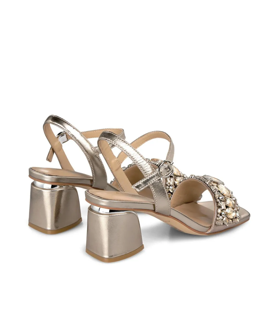 Sandalia de tacón de mujer con pedrería. Con cierre de hebilla y puntera cuadrada. La altura del tacón es de 5,8cm.