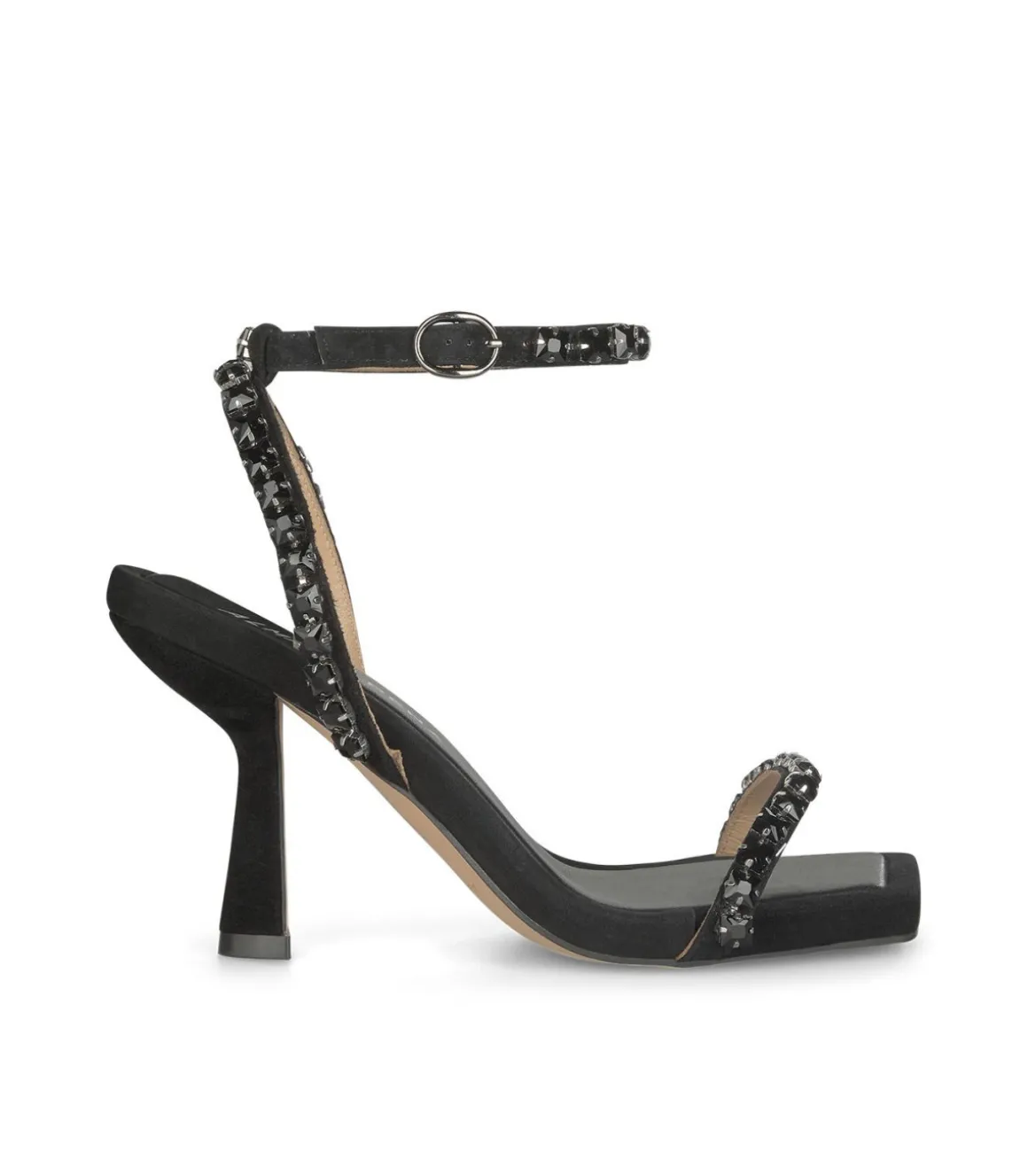 Sandalia de tacón de mujer con tiras de pedrería. Sin cierre, la altura del tacón es de 9cm.