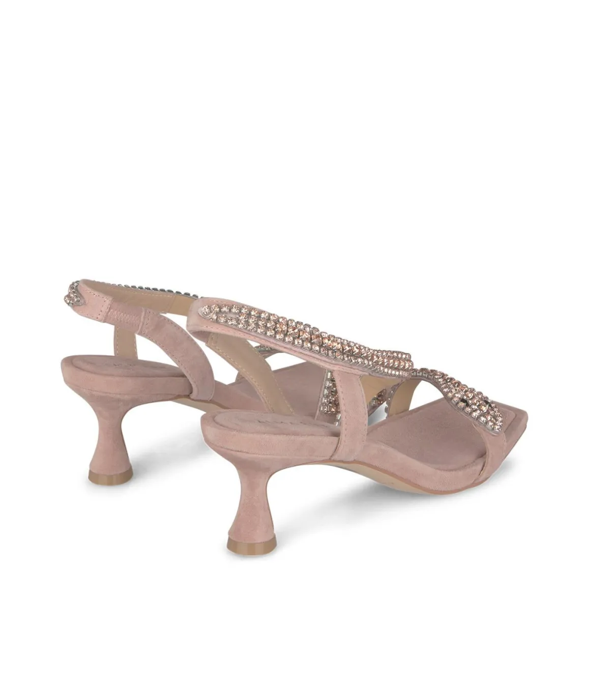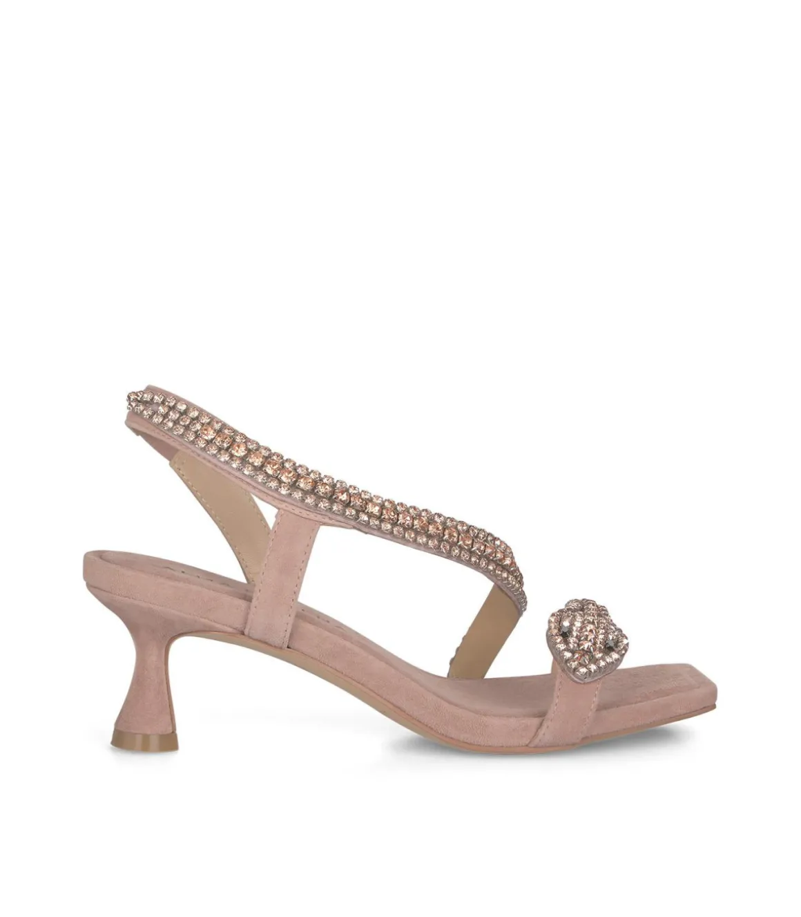 Sandalia de tacón chupete de mujer con tira de pedrería cruzando el empeine. Sin cierre y puntera cuadrada. La altura del tacón es de 6cm.