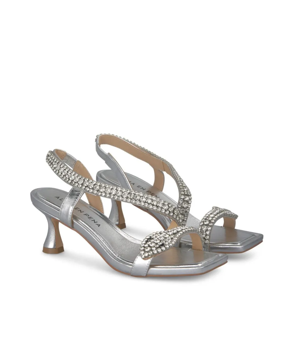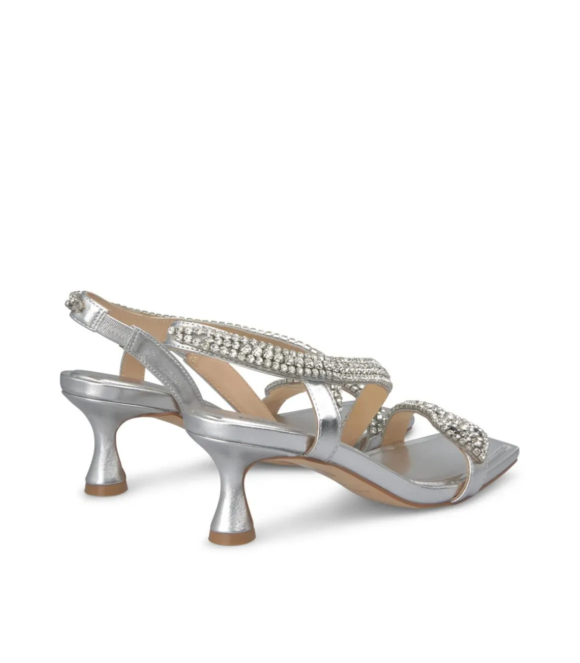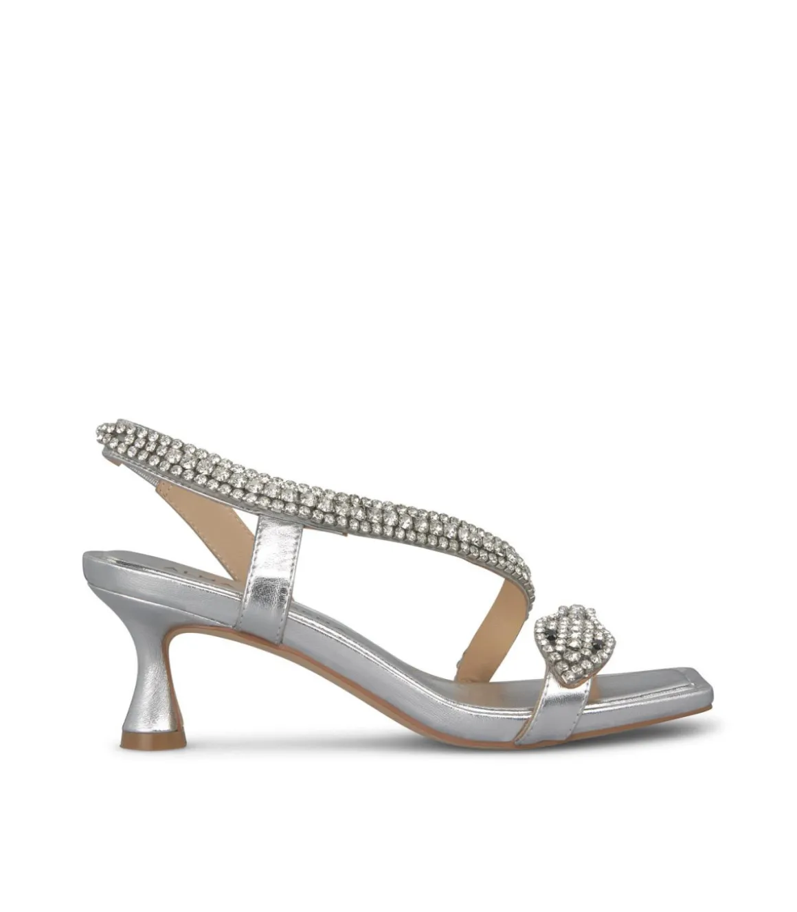 Sandalia de tacón chupete de mujer con tira de pedrería cruzando el empeine. Sin cierre y puntera cuadrada. La altura del tacón es de 6cm.