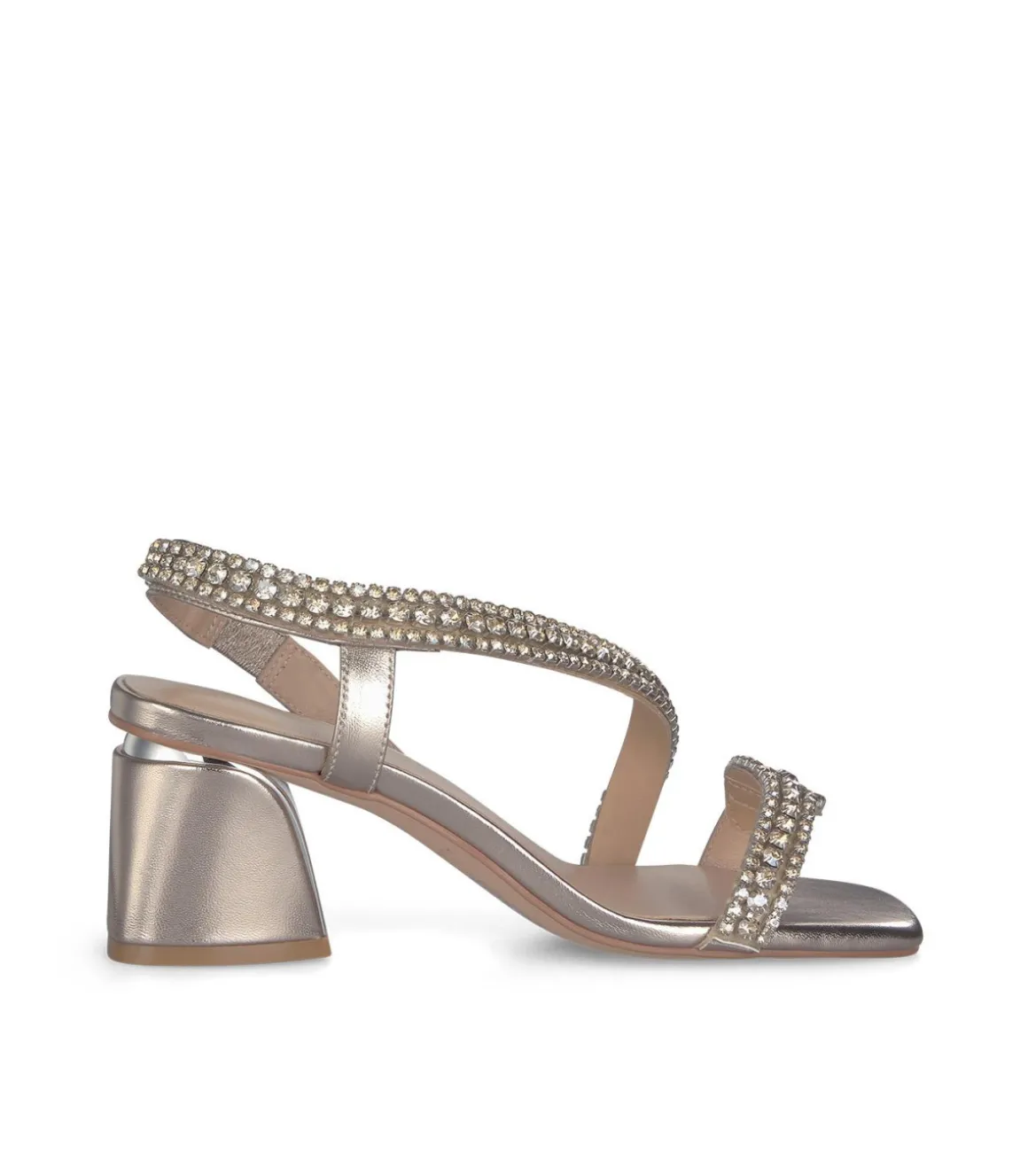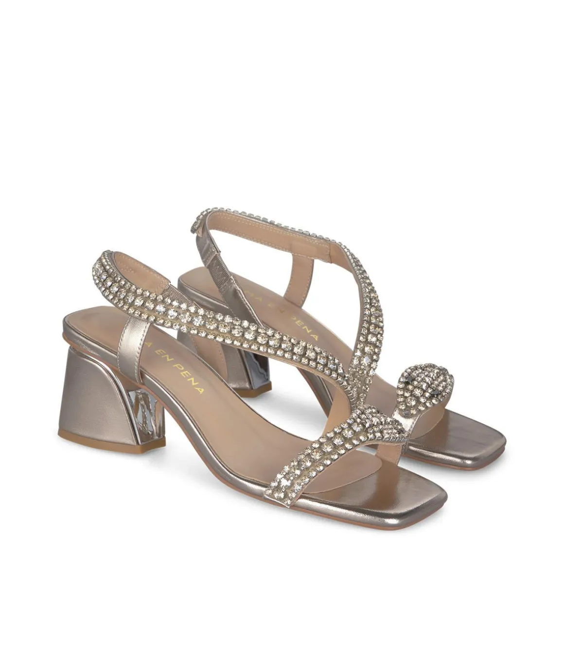Sandalia de tacón de mujer con tira de pedrería en serpiente. Sin cierre y puntera cuadrada. La altura del tacón es de 5,8cm.