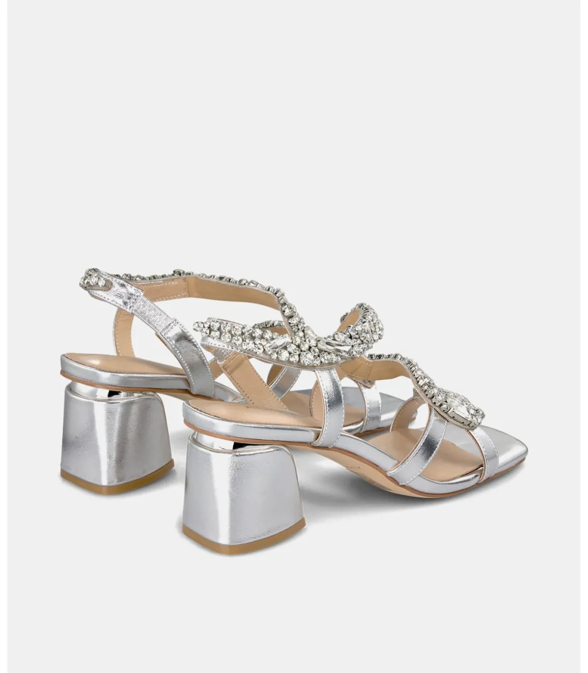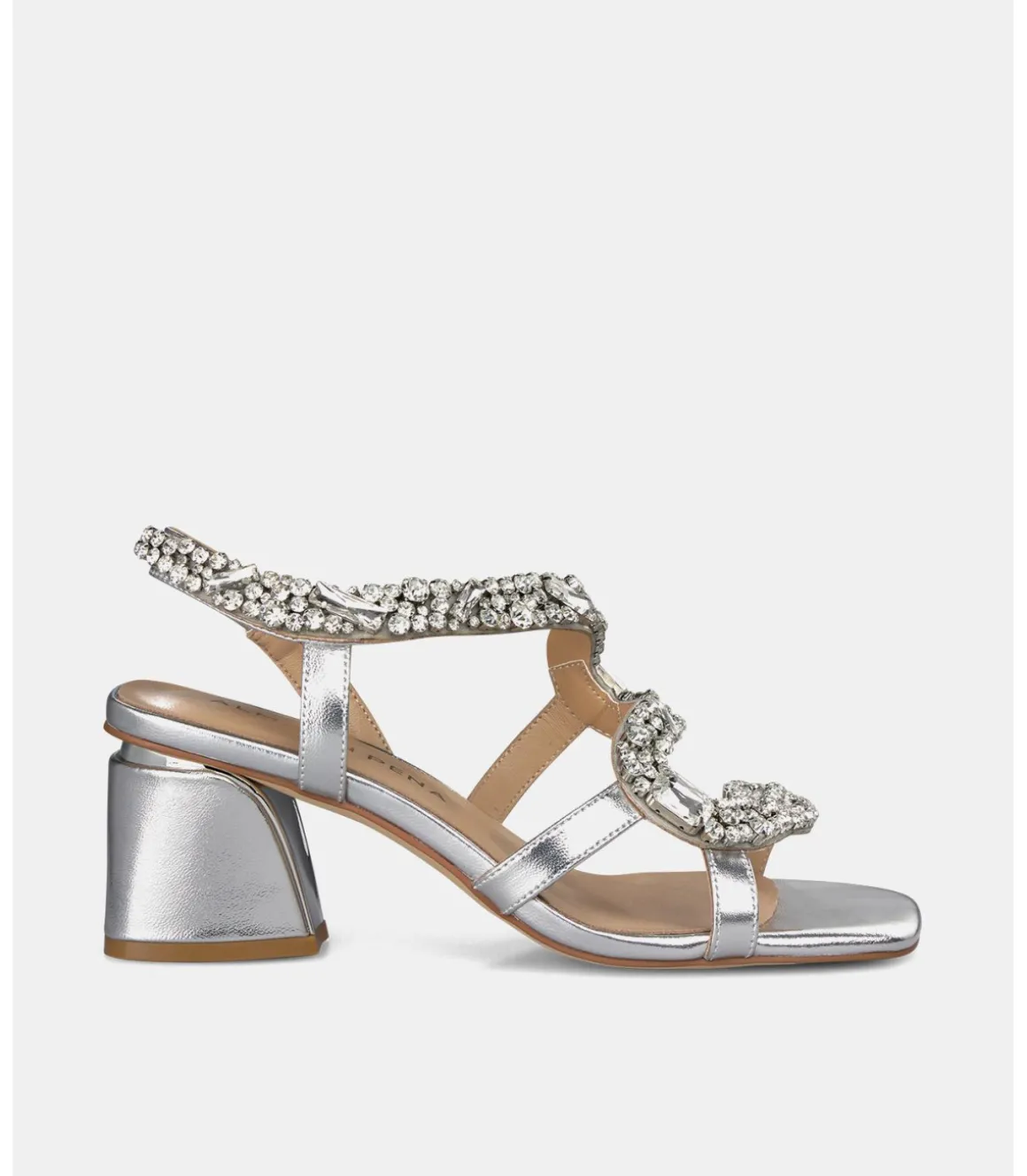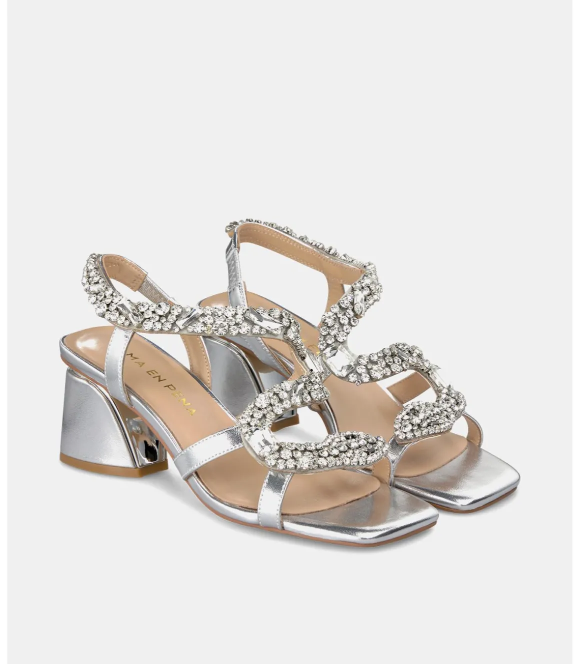 Sandalia de tacón de mujer con tira de pedrería en serpiente. Sin cierre y puntera cuadrada. La altura del tacón es de 5,8cm.