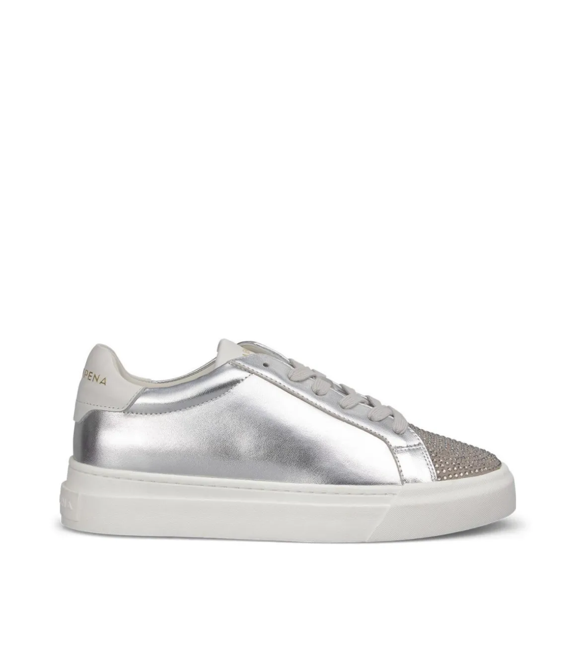 Sneaker de mujer realizada en piel con detalles de pedrería. Cierre con cordones y puntera redonda. Suela con plataforma de 3,8cm.