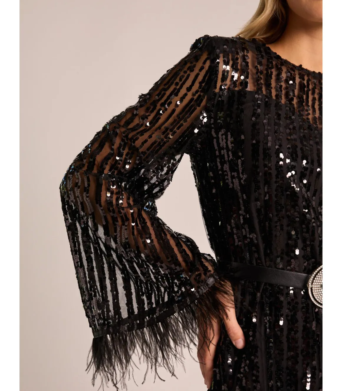 Vestido de mujer con lentejuelas y transparencias. Con cuello en redondo y manga larga con plumas. Confeccionado en poli…