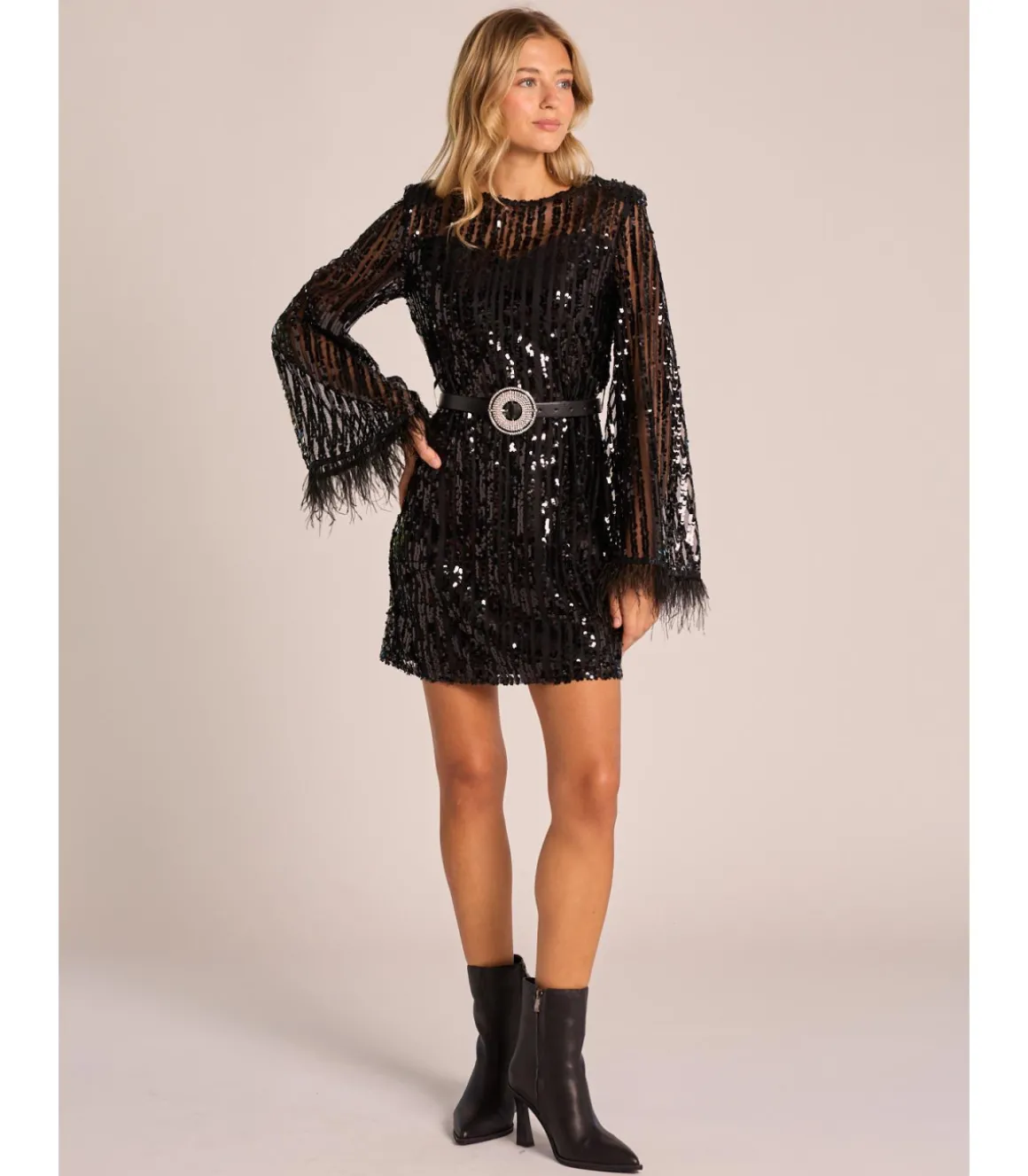 Vestido de mujer con lentejuelas y transparencias. Con cuello en redondo y manga larga con plumas. Confeccionado en poliéster. Medidas de la modelo: altura 1,69cm, pecho 82cm, cintura 60cm y cadera 88cm.