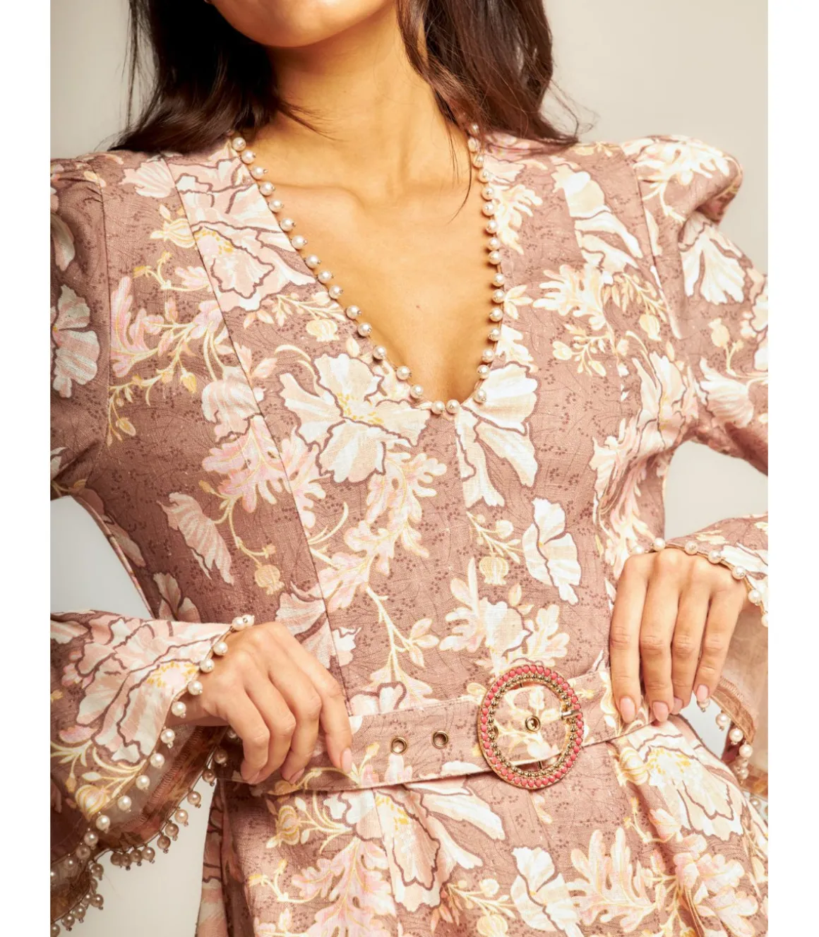Vestido corto estampado con perlas. Falda con vuelo y manga larga con volantes. Escote en pico. Y cinturón con pedrería. Confeccionado un 80% en ramio y un 20% en algodón. Cierre con cremallera trasera. Las medidas de la modelo vistiendo la talla S son: altura 1,68cm, pecho 87cm, cintura 63cm y cadera 88cm.