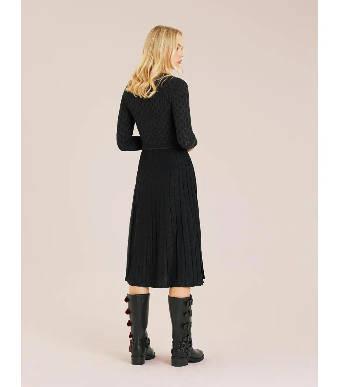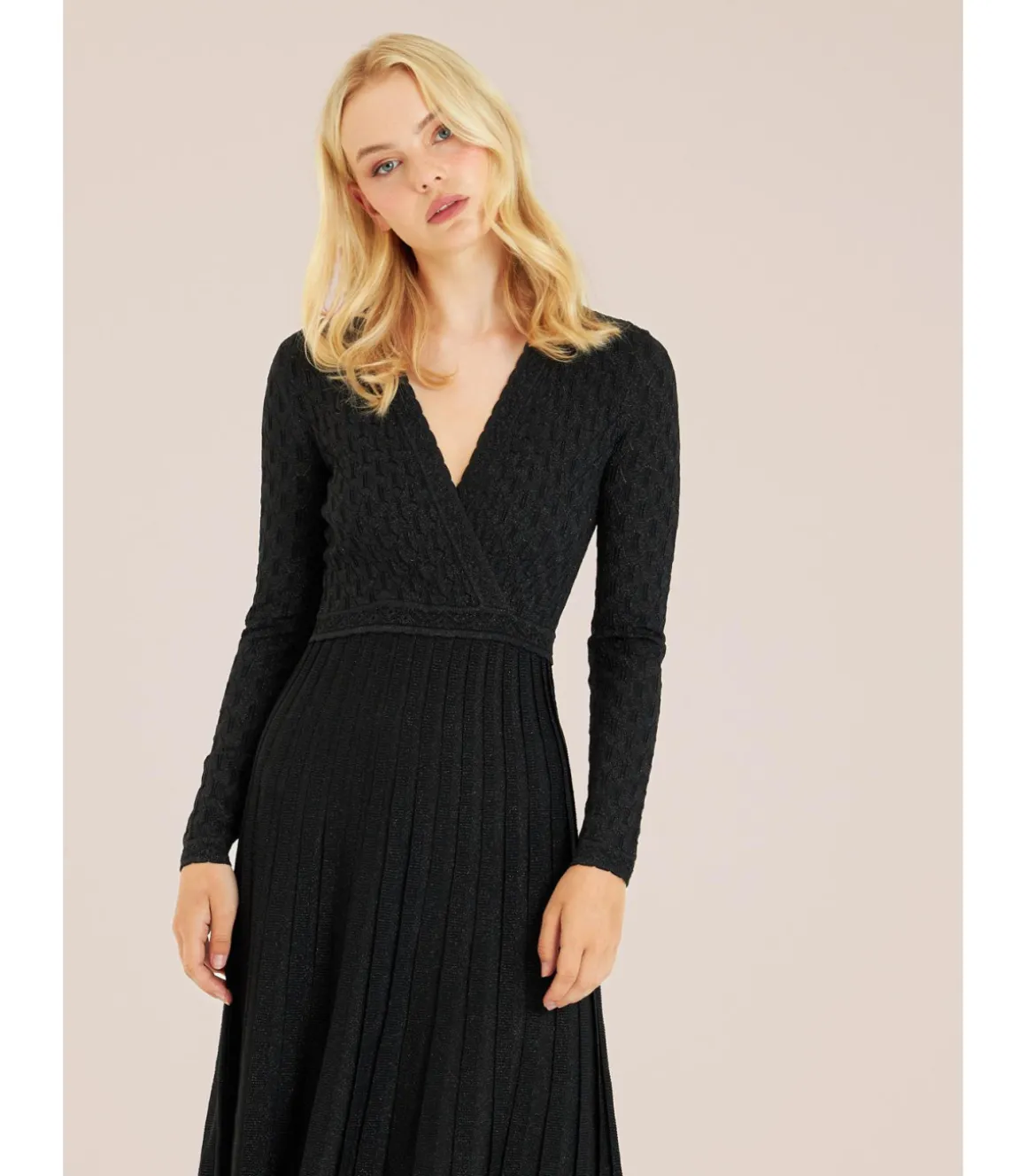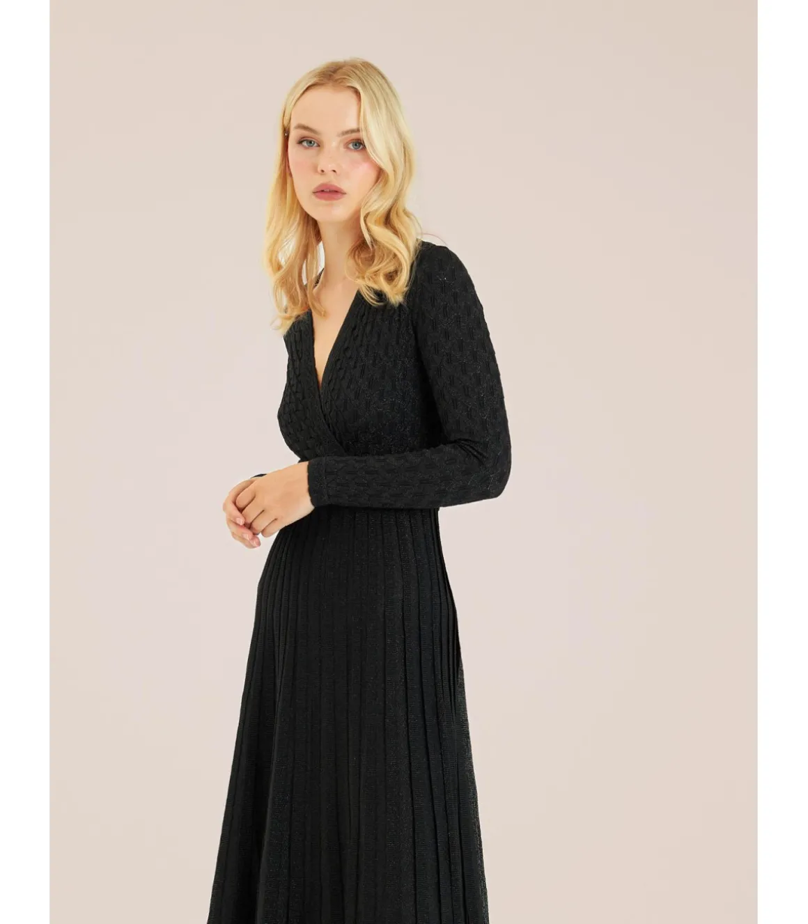 Vestido largo con calados de mujer. Cuello en pico y cintura ajustable. Medidas de la modelo: altura 1,69 cm, pecho 82 cm, cintura 60 cm y cadera 88 cm.