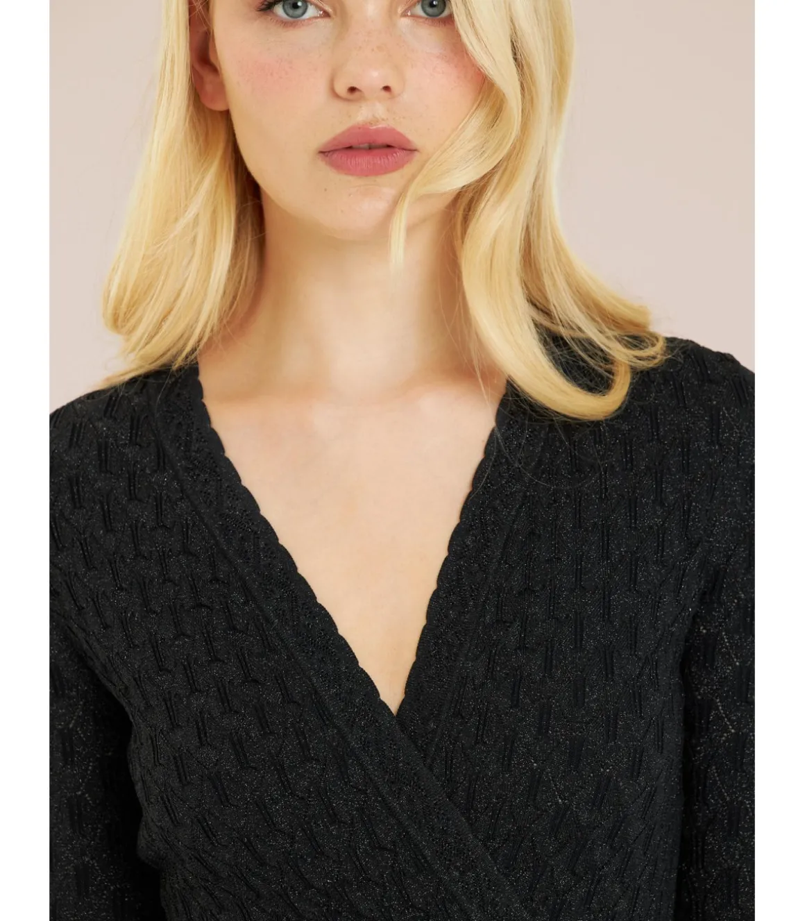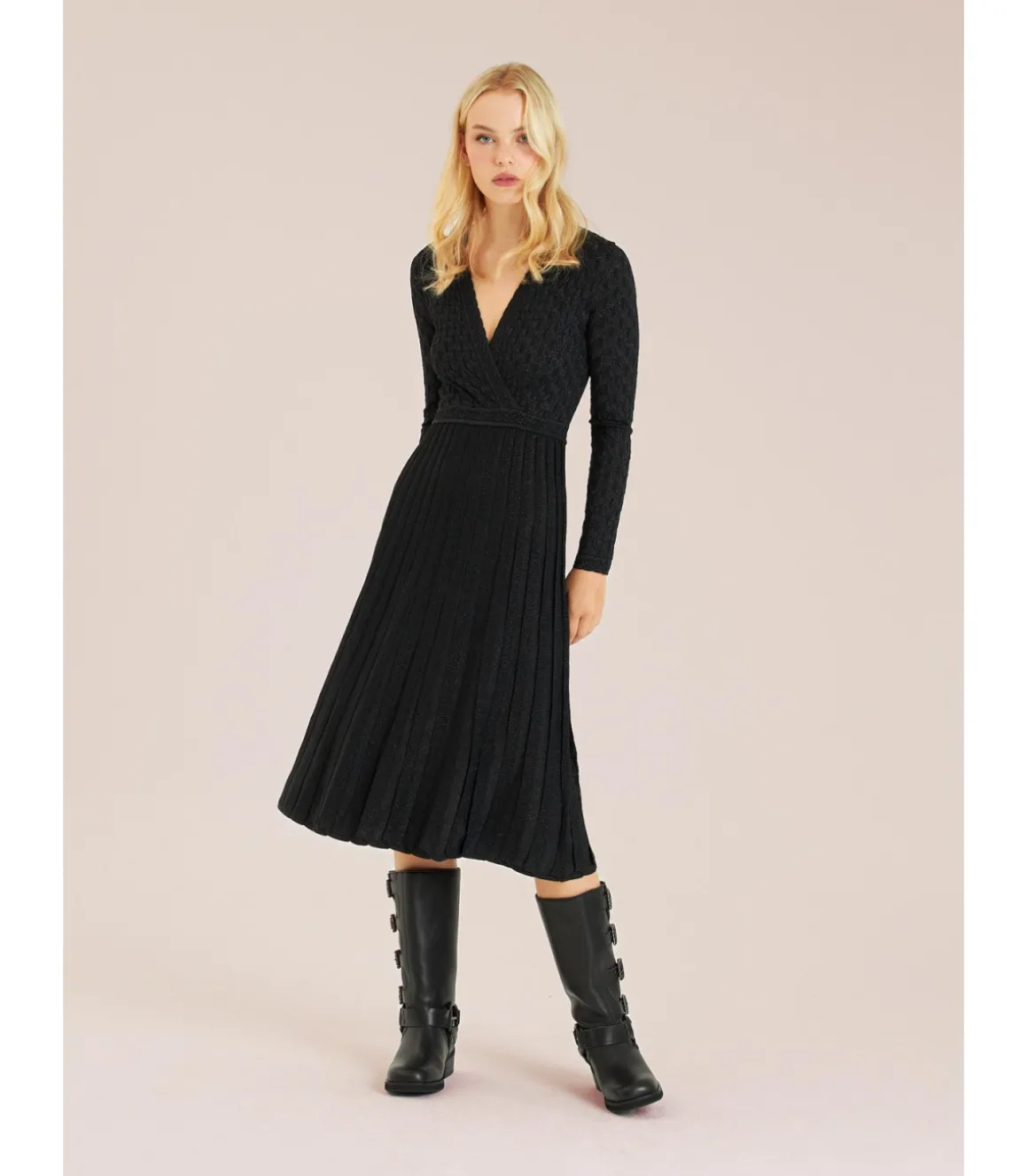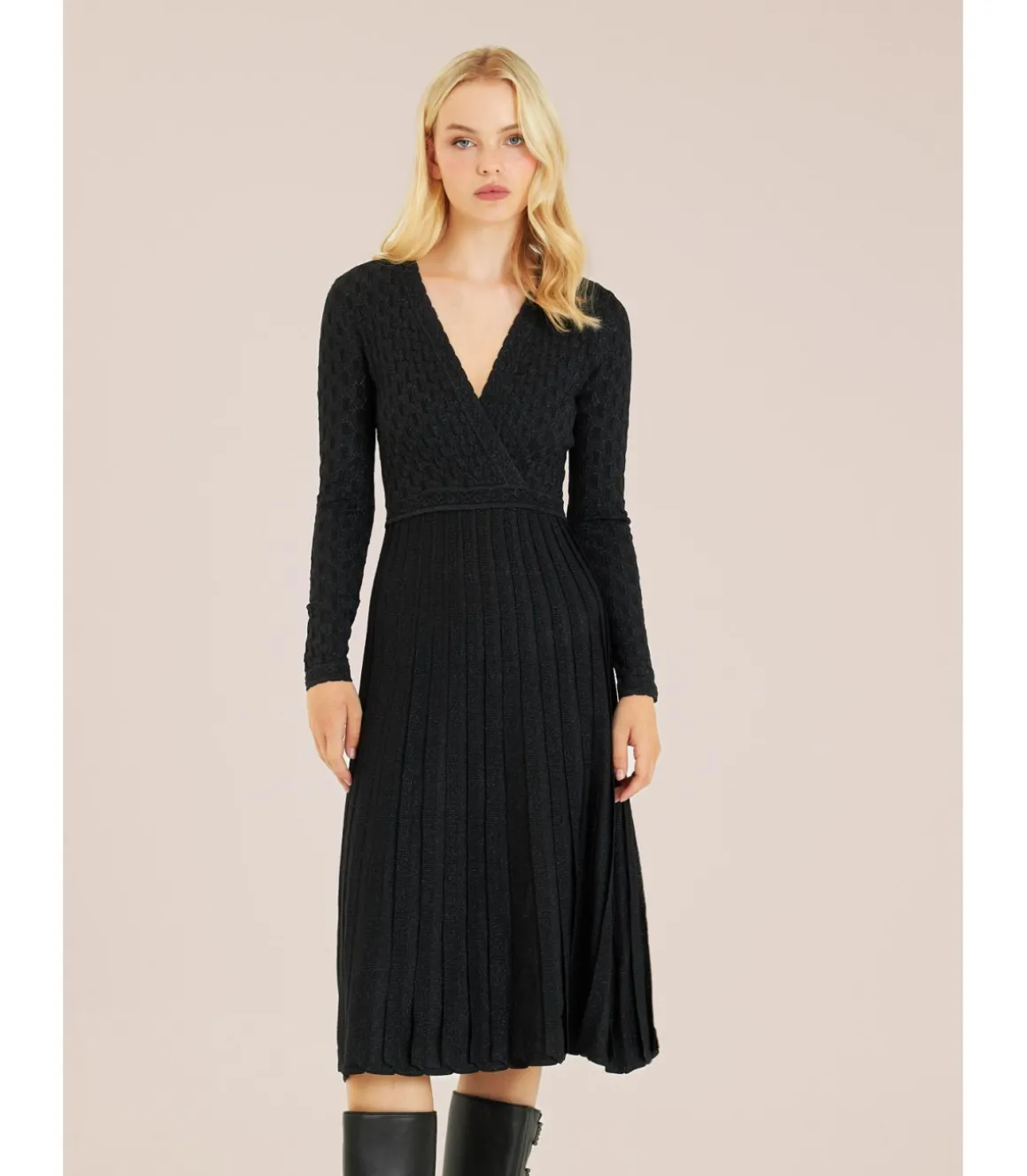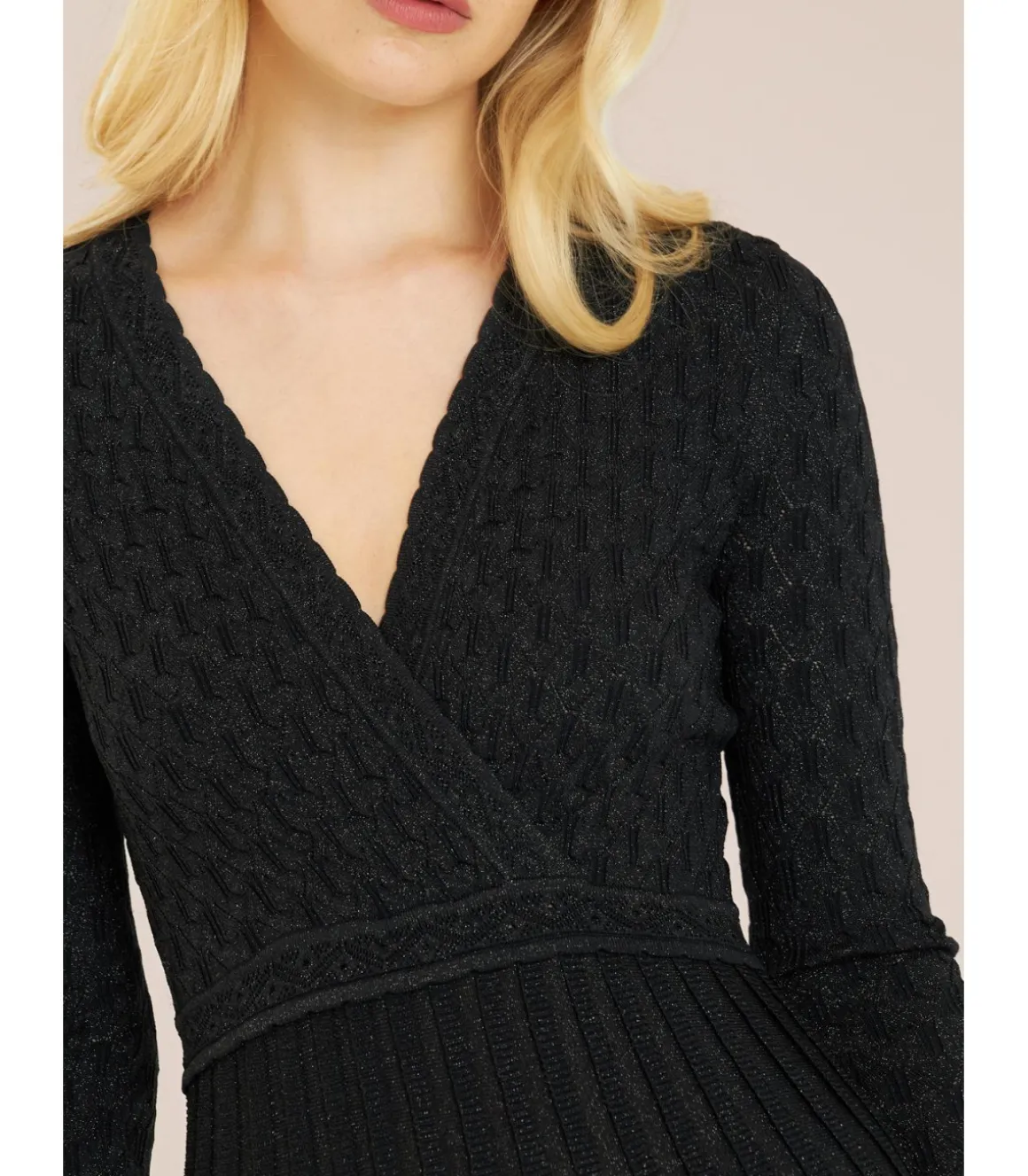 Vestido largo con calados de mujer. Cuello en pico y cintura ajustable. Medidas de la modelo: altura 1,69 cm, pecho 82 cm, cintura 60 cm y cadera 88 cm.