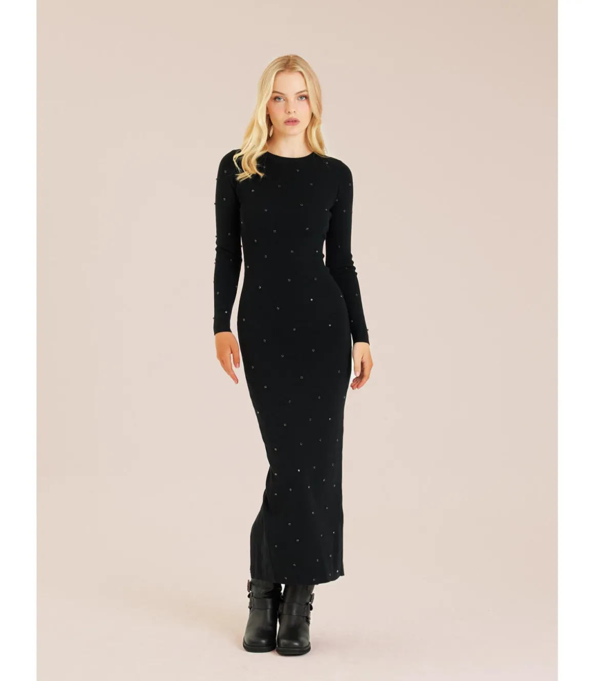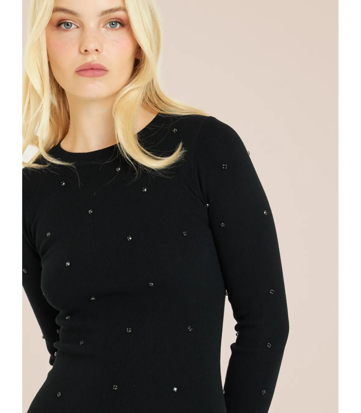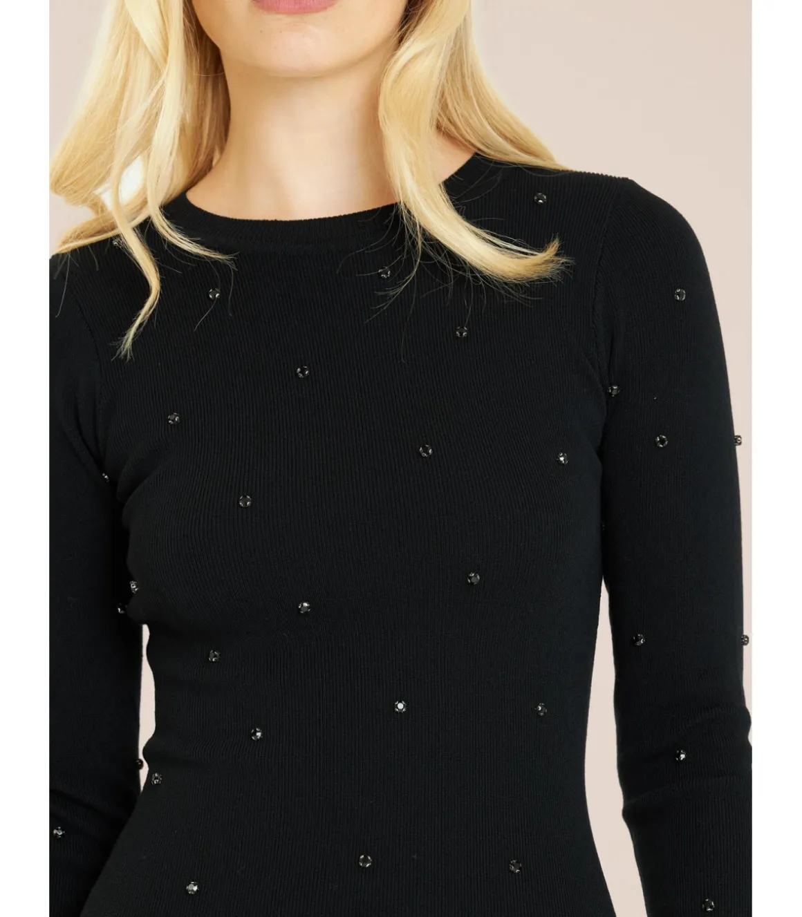 Vestido de mujer ajustado con detalles de pedrería. Con cuello redondo. Confeccionado en viscosa y poliéster. Medidas de la modelo: altura 1,69cm, pecho 82cm, cintura 60cm y cadera 88cm.