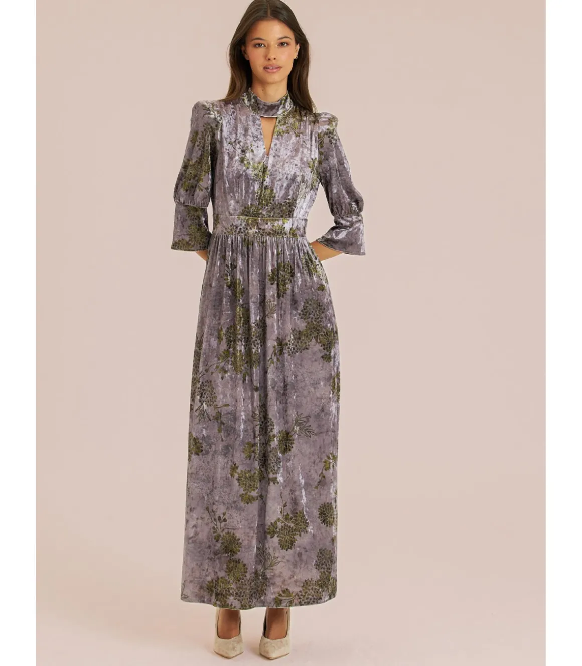 Vestido largo terciopelo de mujer. Cuello en pico y cintura marcada, cierre con cremallera trasera. Medidas de la modelo: altura 1,69cm, pecho 82cm, cintura 60cm y cadera 88cm.