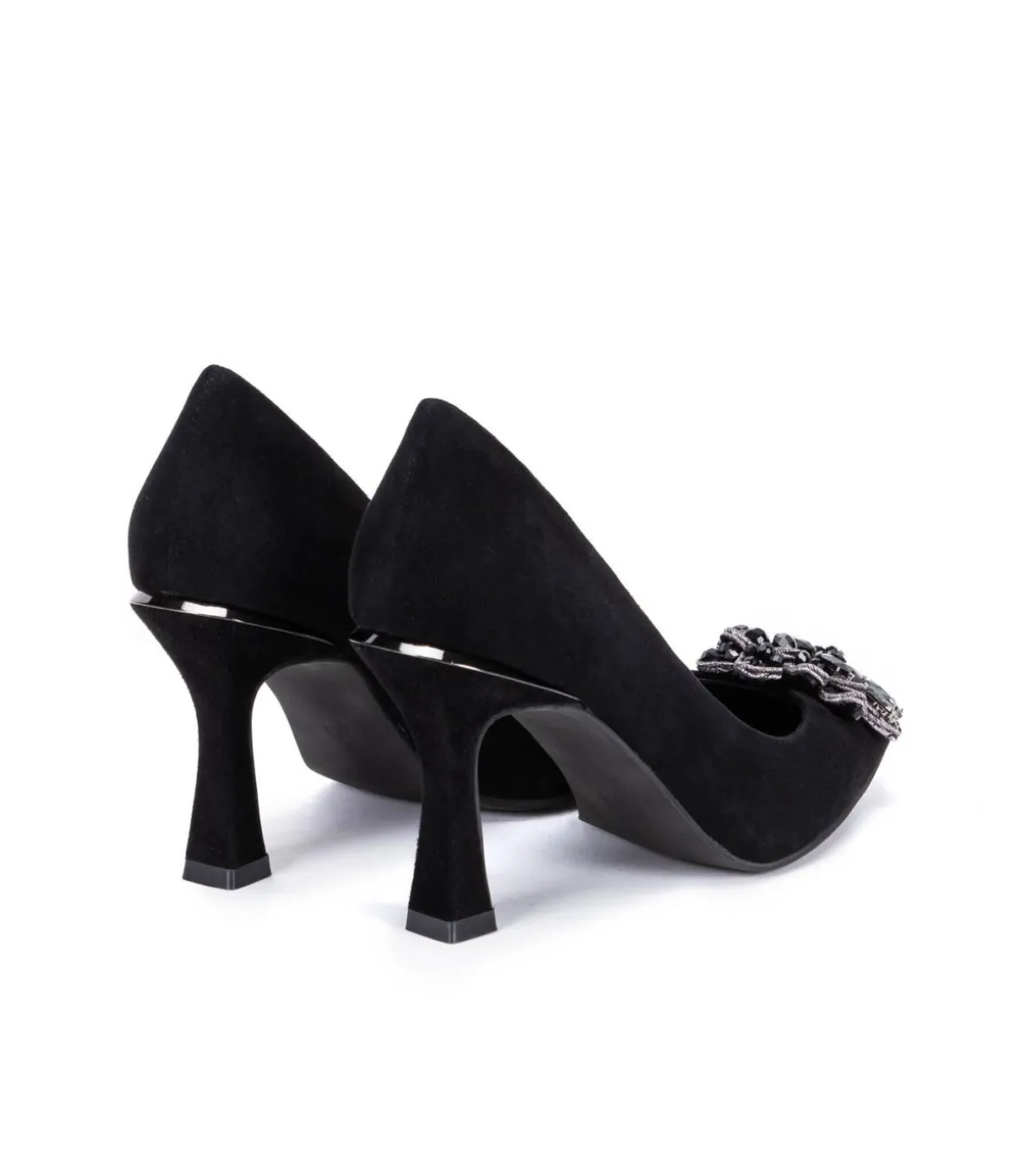 Zapato de tacón realizado en piel con adorno de flor. La altura del tacón es de 8,8cm.