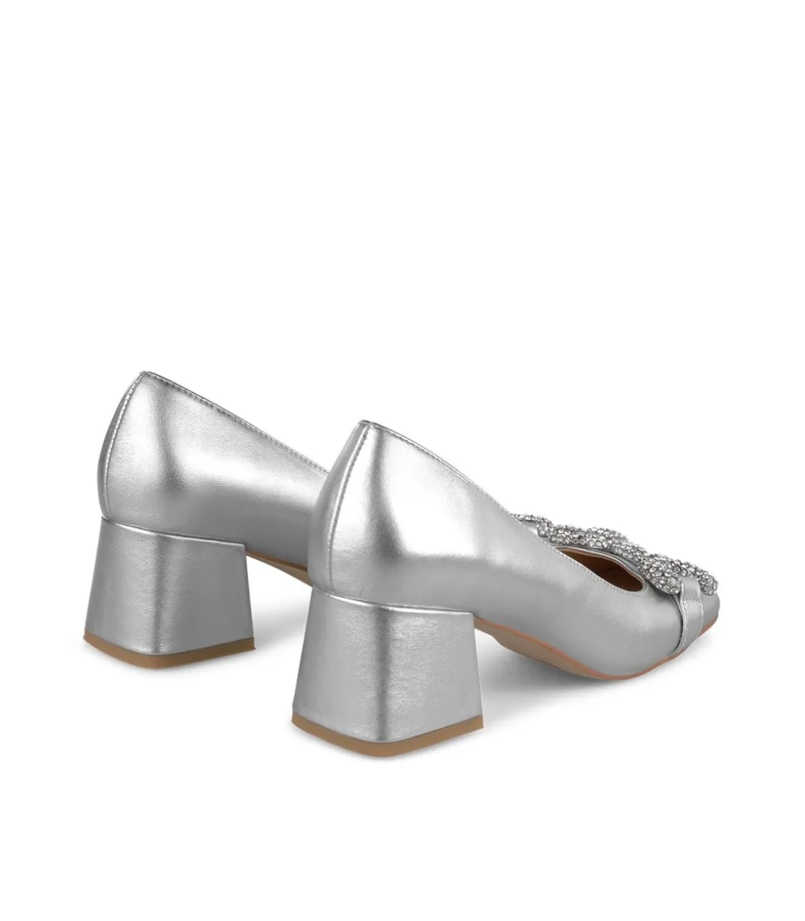 Zapato de tacón realizado en piel con adorno de estribo cubierto con pedrería. Puntera cuadrada y tacón bloque. La altura del tacón es de 7,5cm.