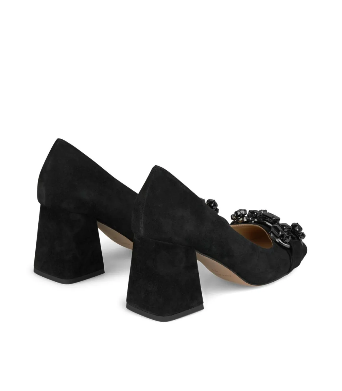 Zapato de tacón realizado en piel con adorno de estribo cubierto con pedrería. La altura del tacón es de 7,5cm.