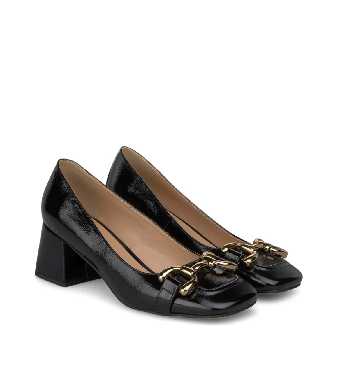 Zapato de tacón realizado en piel con adorno de estribo. Tacón bloque y puntera cuadrada. La altura del tacón es de 7,5cm.