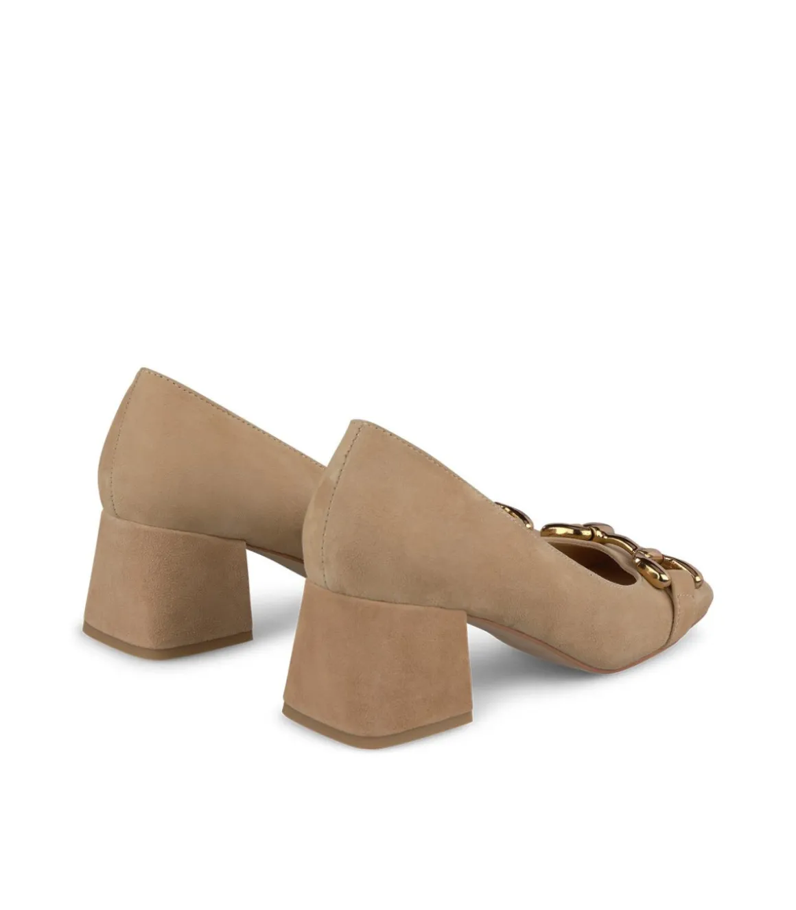 Zapato de tacón realizado en piel con adorno de estribo. Tacón bloque y puntera cuadrada. La altura del tacón es de 7,5cm.