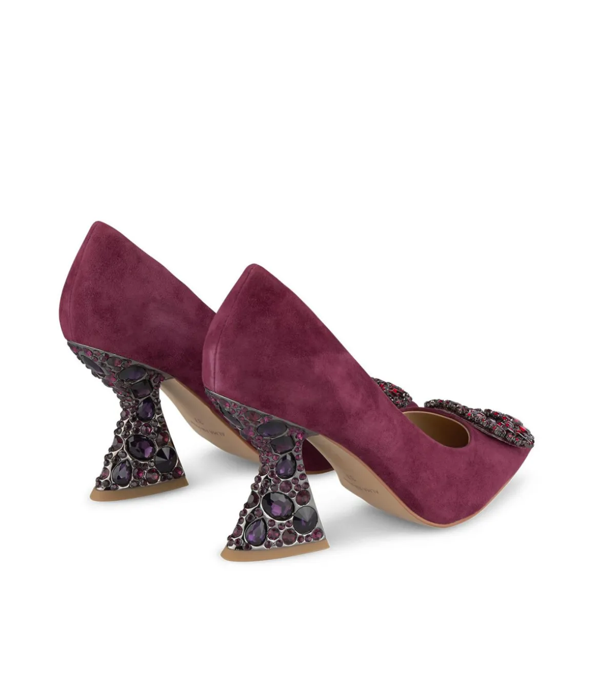 Zapato con tacón en forma de embudo. Broche con pedrería. Cubierto con pedrería. La altura del tacón es de 10cm.