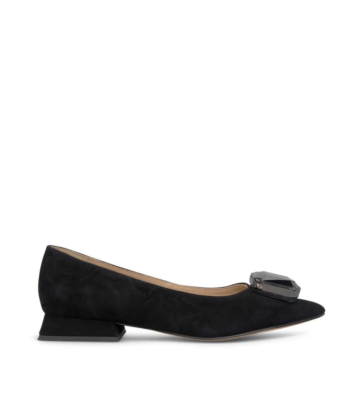 Bailarina plana de mujer con detalle de pedrería en la puntera afilada. Confeccionada en piel sin cierre y la altura del tacón es de 2,2cm.