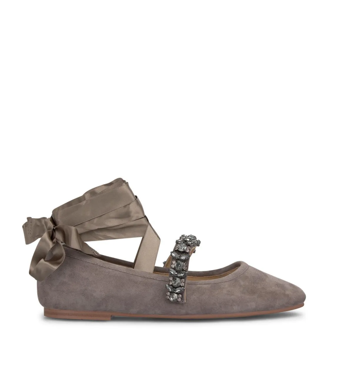 Bailarina plana de mujer con tira de pedrería, puntera redondeada y lazo atado al tobillo. Confeccionada en piel y la altura de tacón es de 1cm.