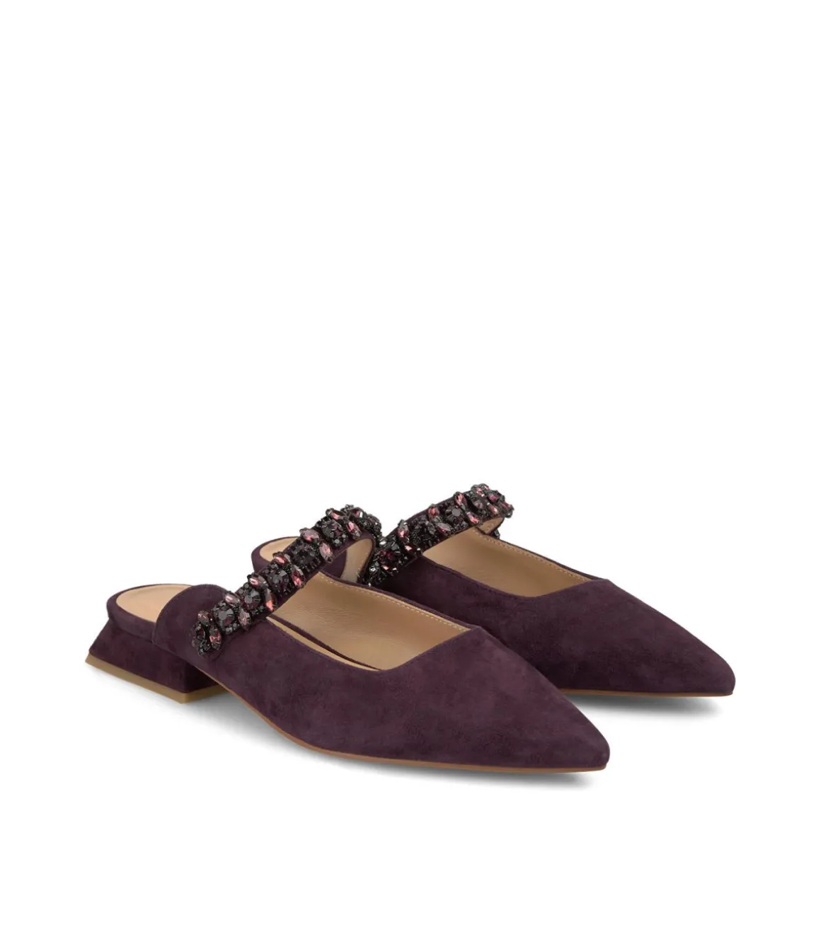 Zapato plano destalonado con tira de pedrería y puntera afilada. Confeccionado en piel y la altura del tacón es de 2,2cm.