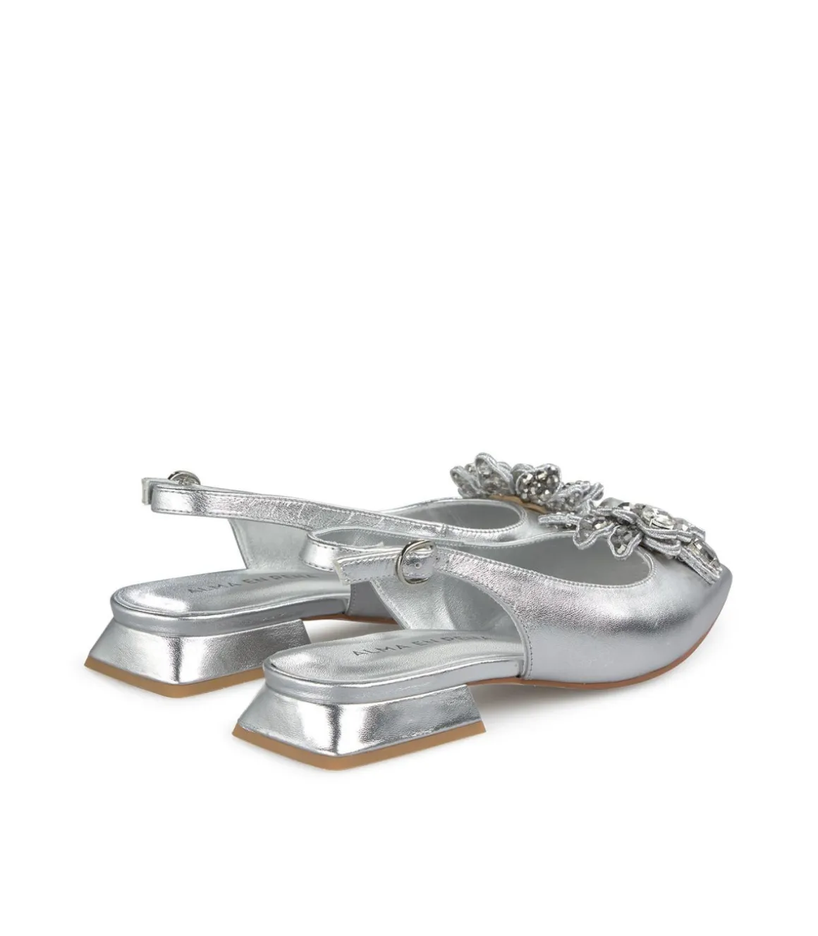 Zapato plano de mujer realizado en piel con adorno flor de pedrería. Sin cierre y puntera afilada. La altura del tacón es de 2cm.