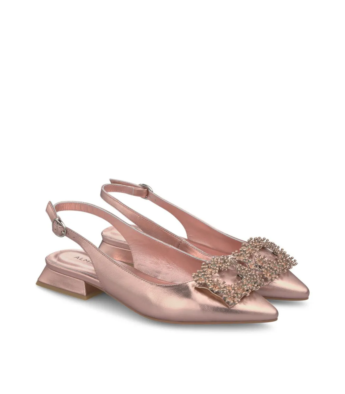 Zapato plano de mujer realizado en piel con adornando cuadrado de pedrería. Con cierre de hebilla y puntera afilada. La altura del tacón es de 2cm.