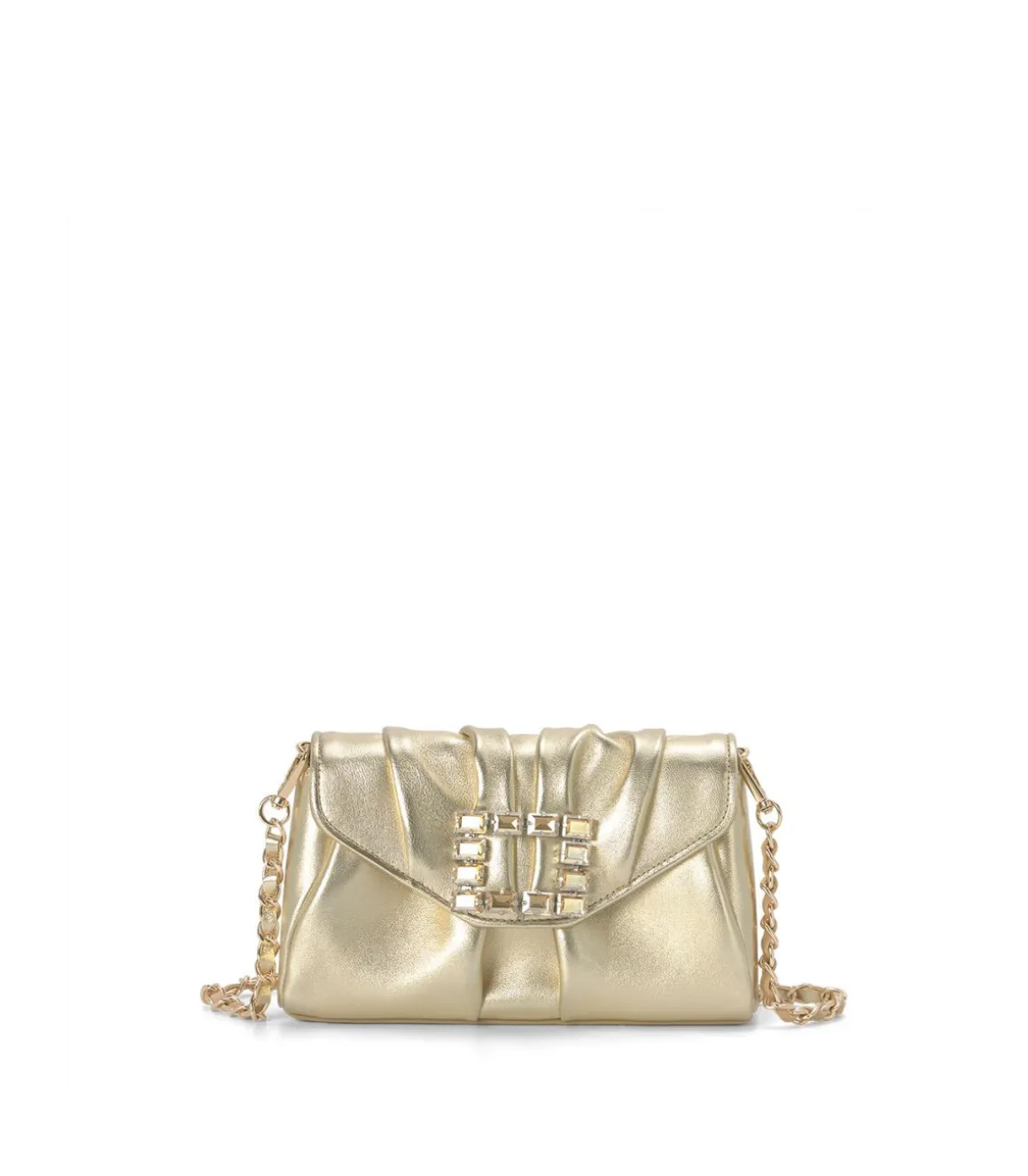 Bolso formato bandolera con adorno cuadrado. Realizado en piel con interior forro textil. Asa de cadena función bandolera. Cierre mediante imán.