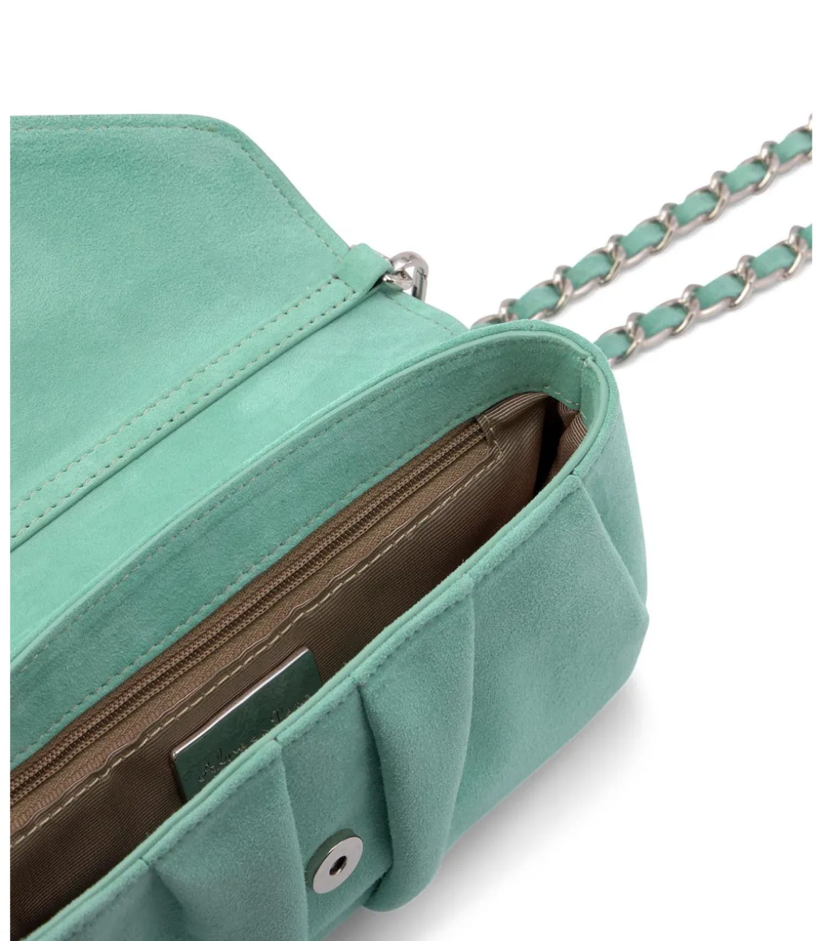 Bolso formato bandolera con adorno cuadrado. Realizado en piel con interior forro textil. Asa de cadena función bandolera. Cierre mediante imán.
