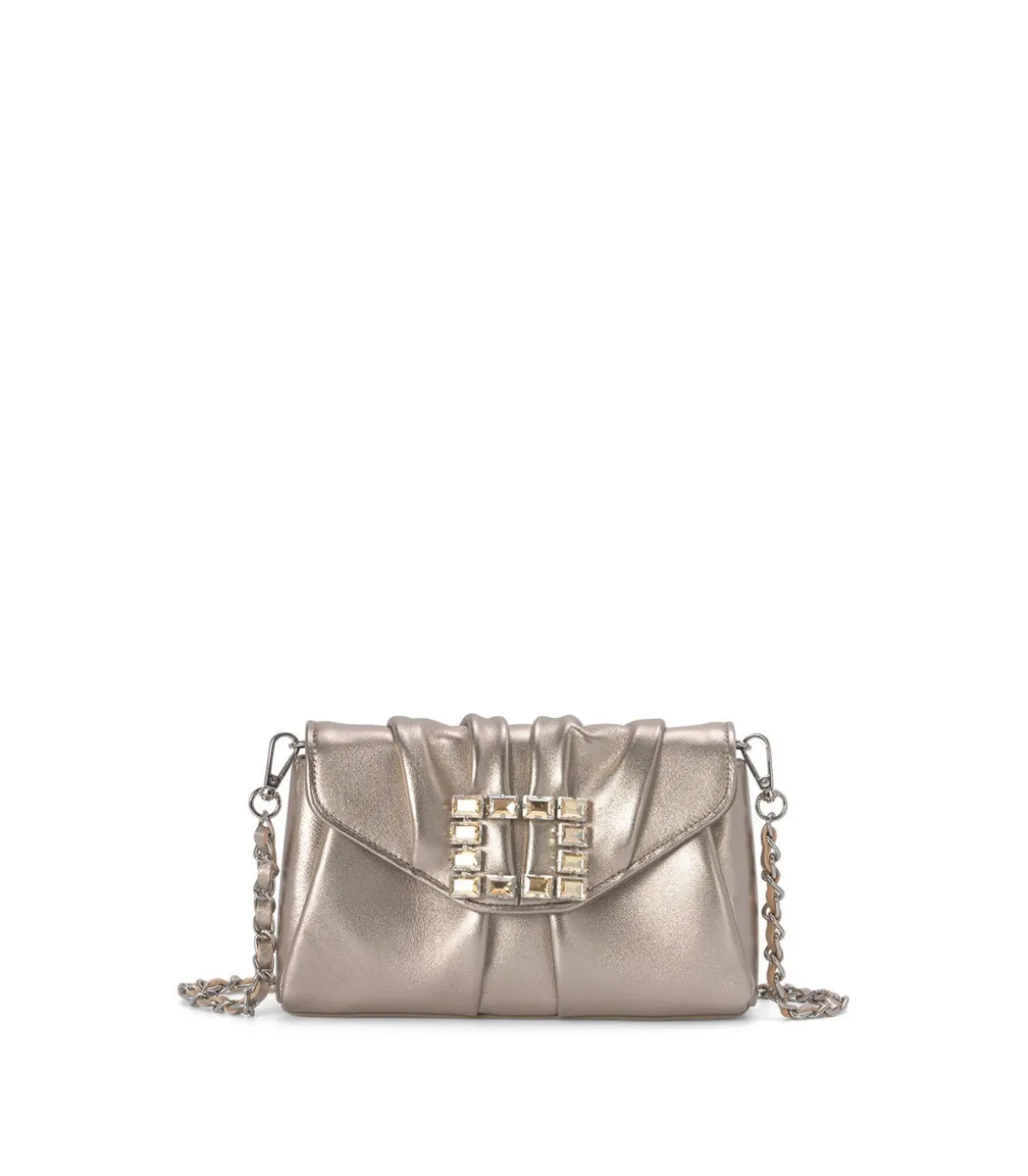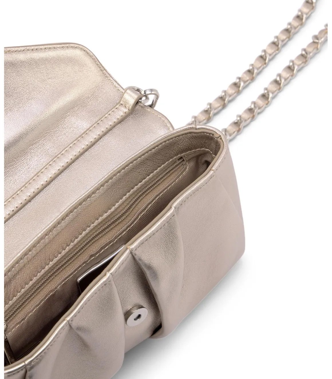 Bolso formato bandolera con adorno cuadrado. Realizado en piel con interior forro textil. Asa de cadena función bandolera. Cierre mediante imán.