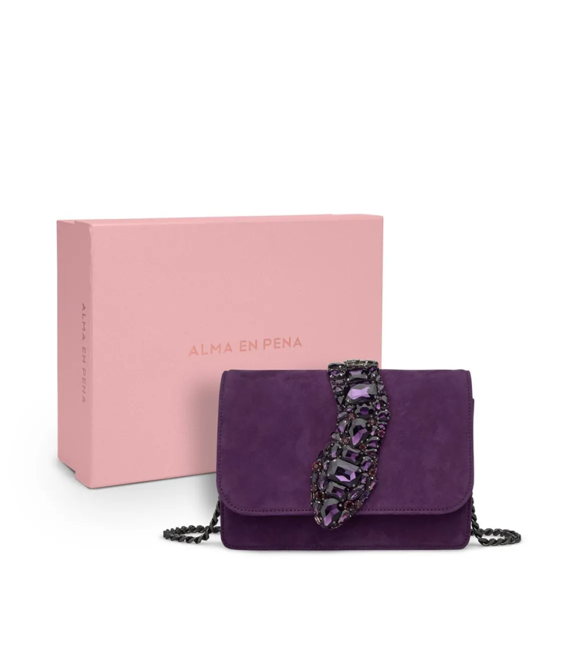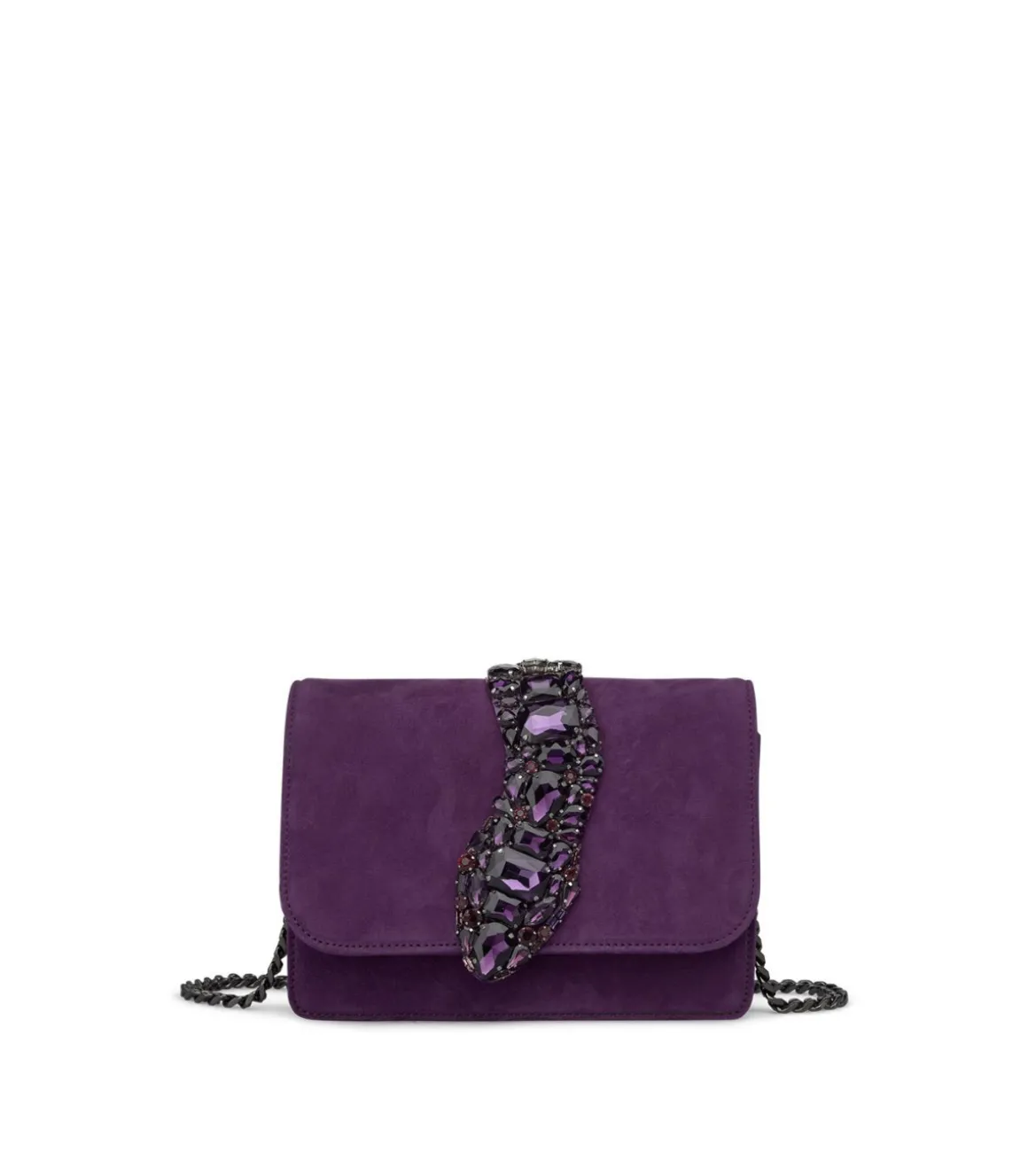Bolso bandolera con la cabeza de serpiente de pedrería en la solapa. Asa larga de cadena metálica función bandolera. Realizado en piel con interior de forro textil. Cierre mediante imán con detalle de joya en la solapa delantera.