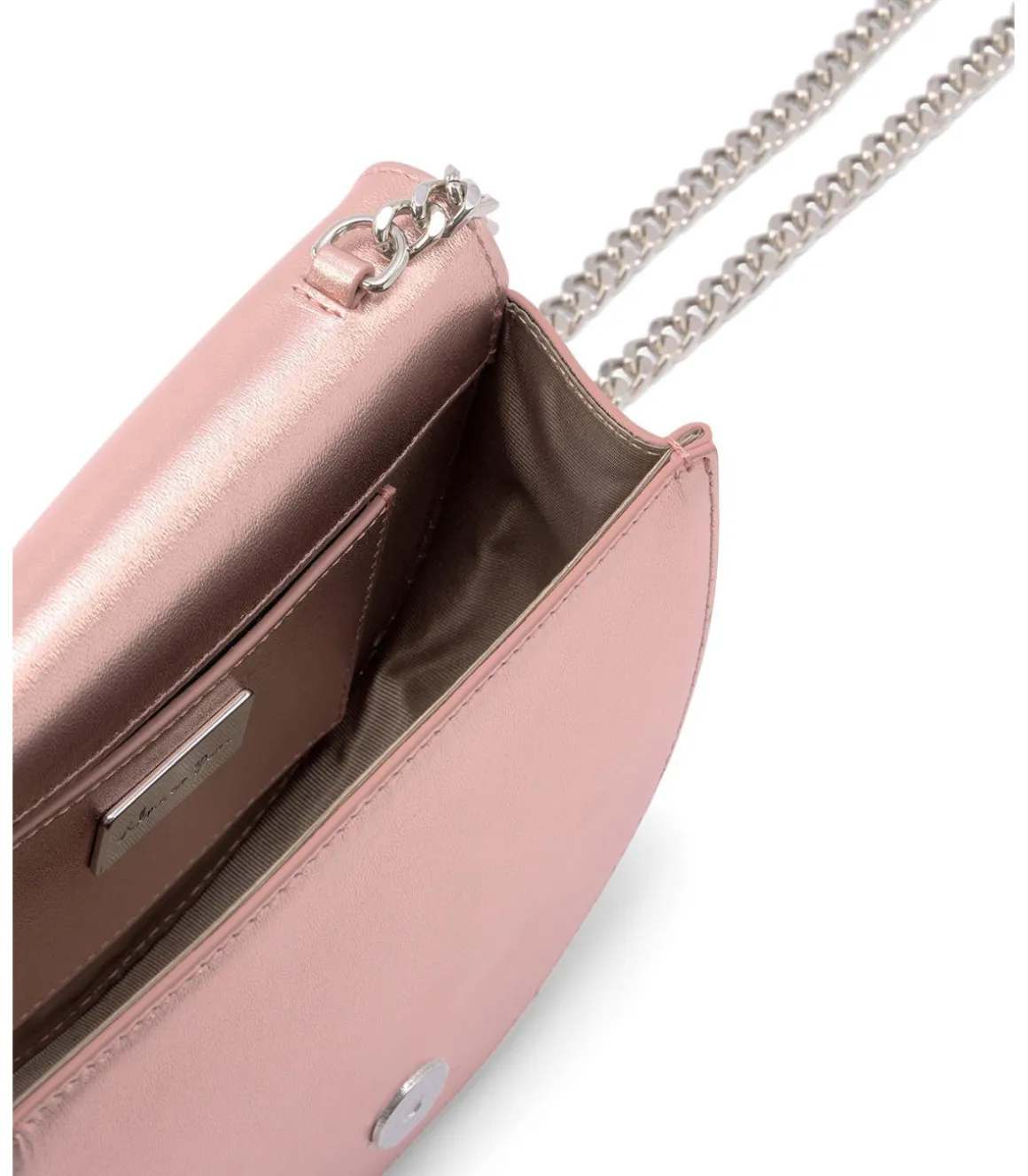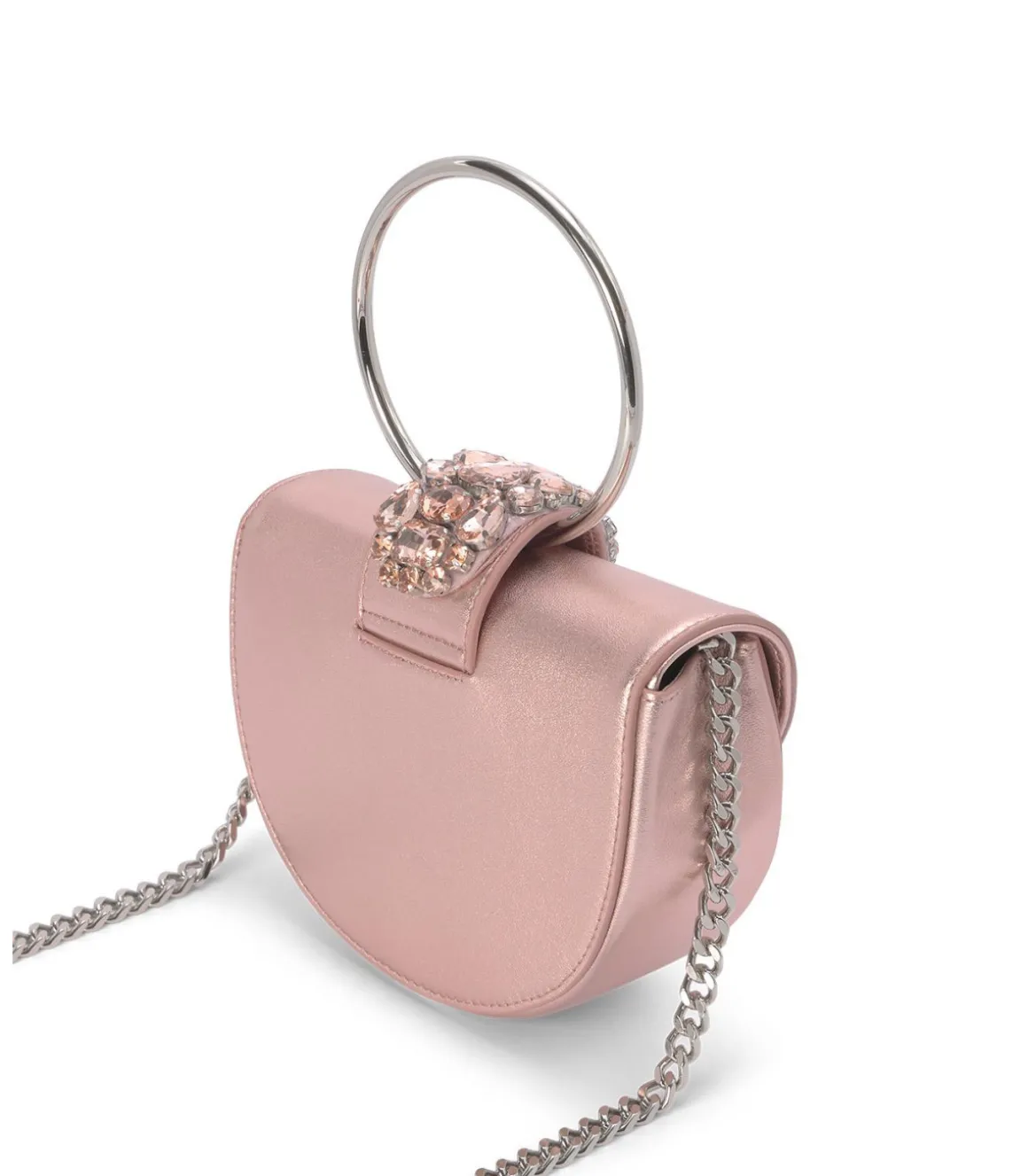 Bolso en forma media luna. Asa de mano metálica en formato anillo y asa larga de cadena metálica función bandolera. Realizado en piel con interior de forro textil. Cierre mediante imán con detalle de joya en la solapa delantera.