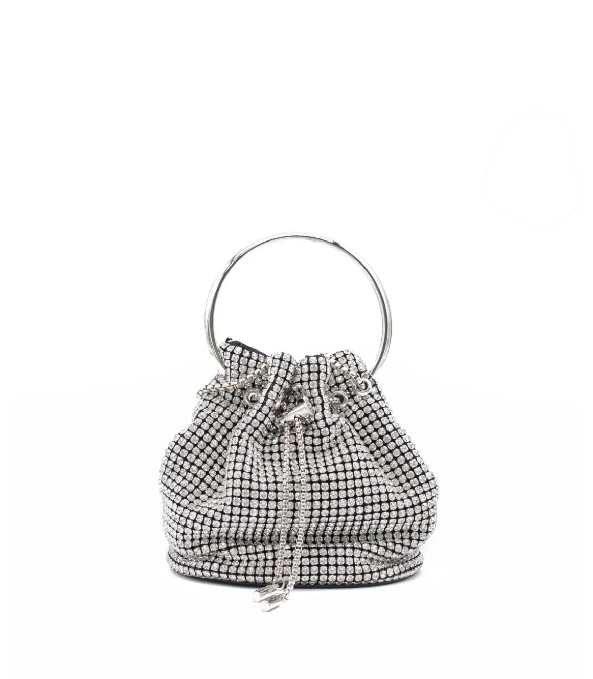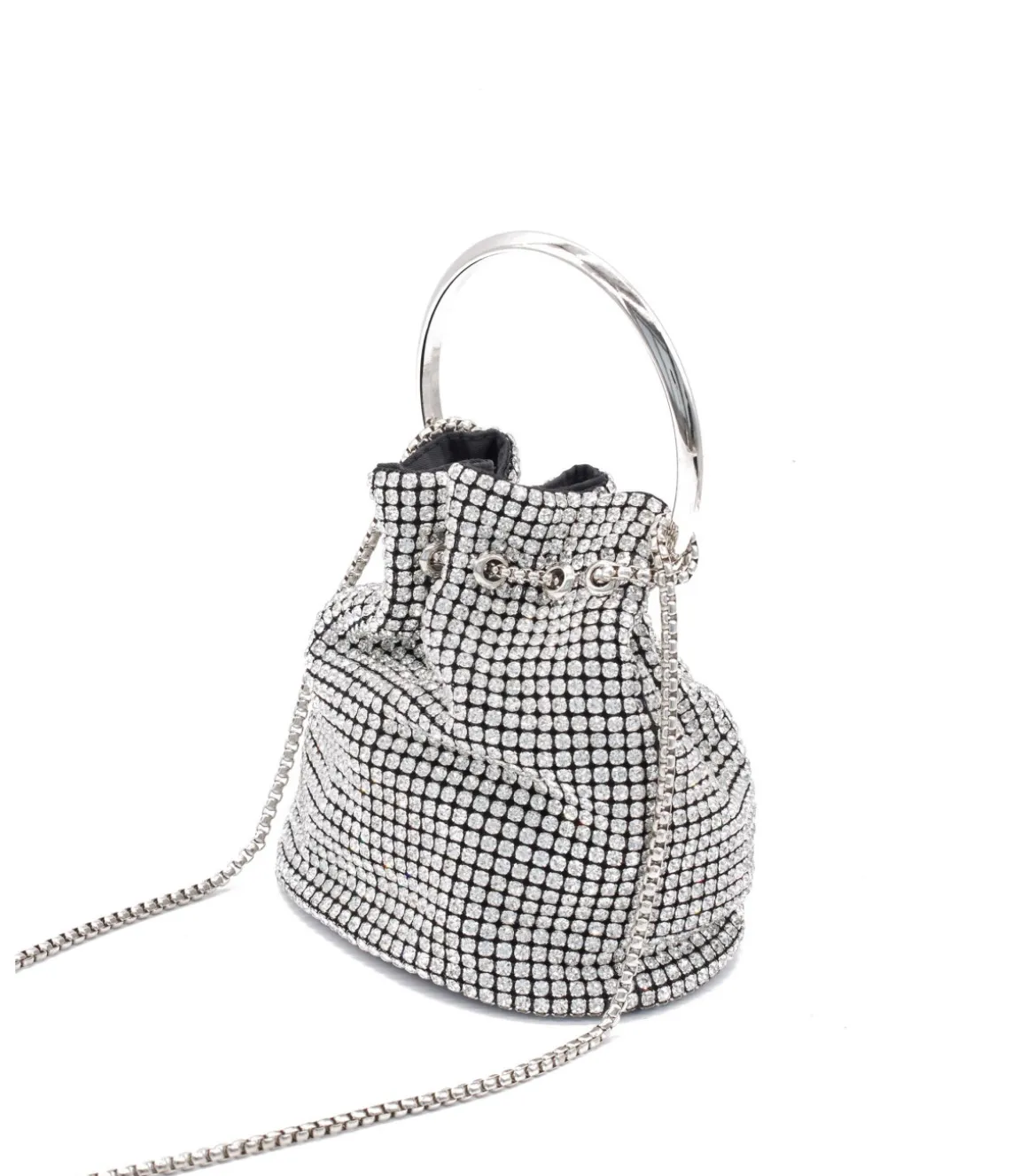 Bolso tipo bombonera conpedrería. Asa metálica circular y cadena metálica función bandolera . Interior de forro textil.
