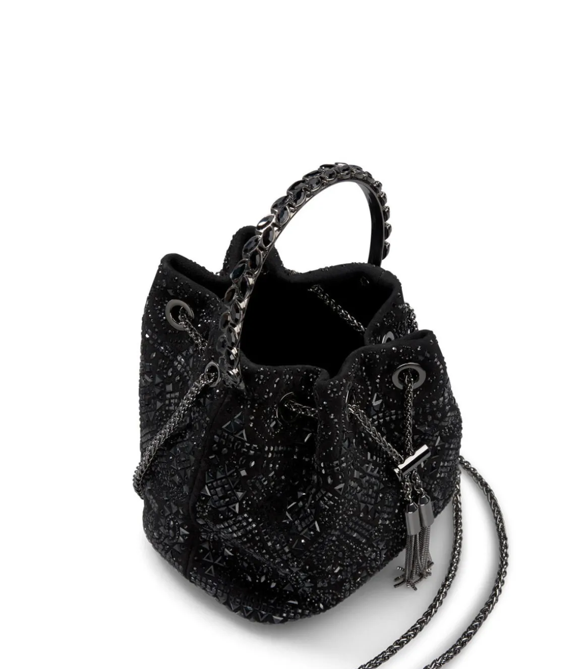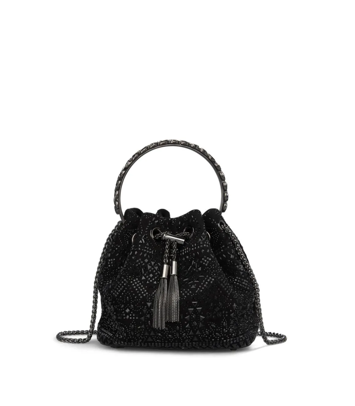 Bombonera cubierta con detalles de pedrería realizada en textil con forro interior textil y detalle colgante. Cierre ajustable. Asa metálica circular y cadena metálica función bandolera.