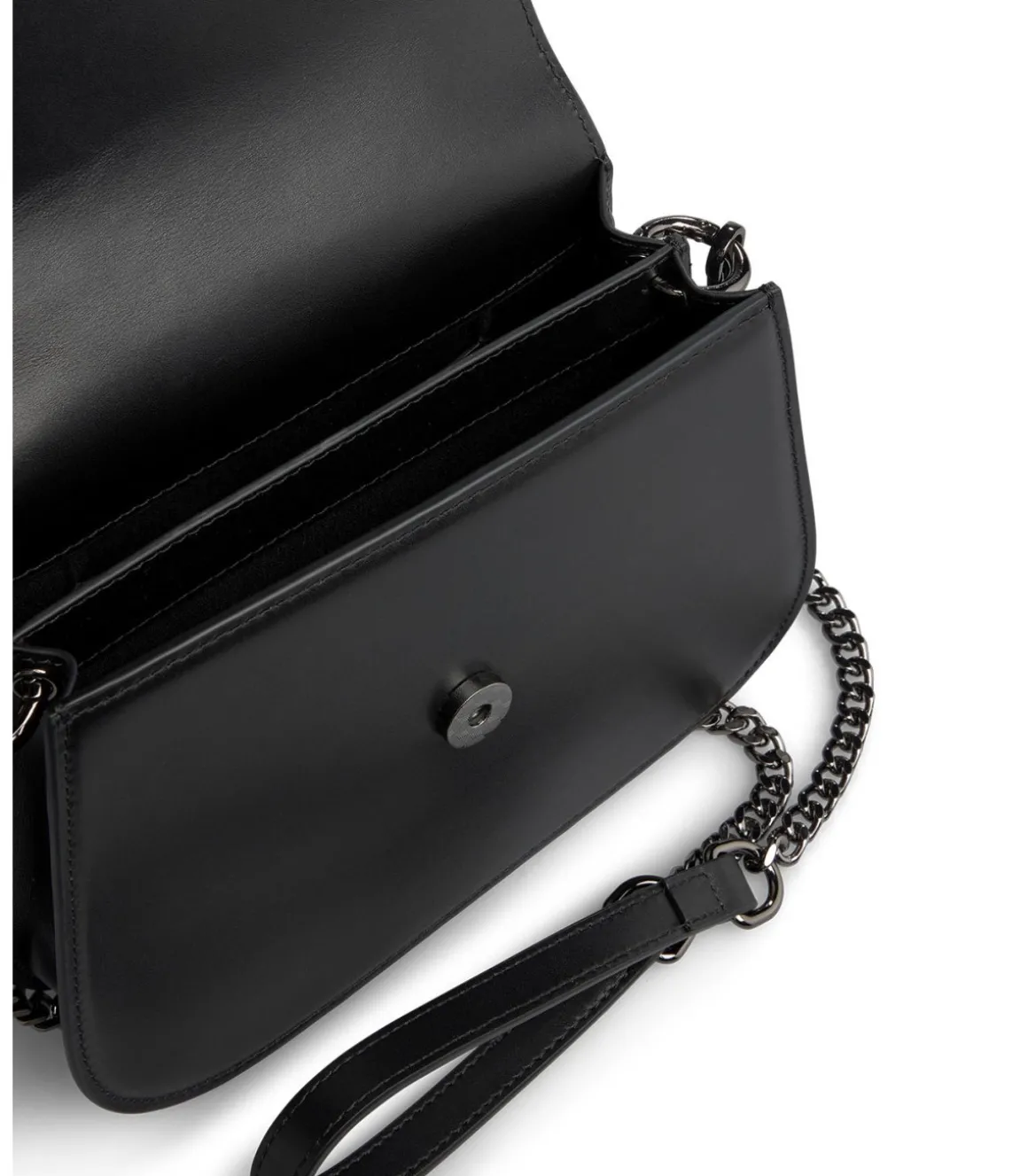 Bolso formato bandolera, detalle cuadrado cubierto con pedrería y flecos colgantes. Asa de mano y asa de cadena metálica larga función bandolera. Realizado en piel con interior de forro textil. Cierre mediante imán con hebilla de joya. Detalle de borla con flecos en la parte inferior.