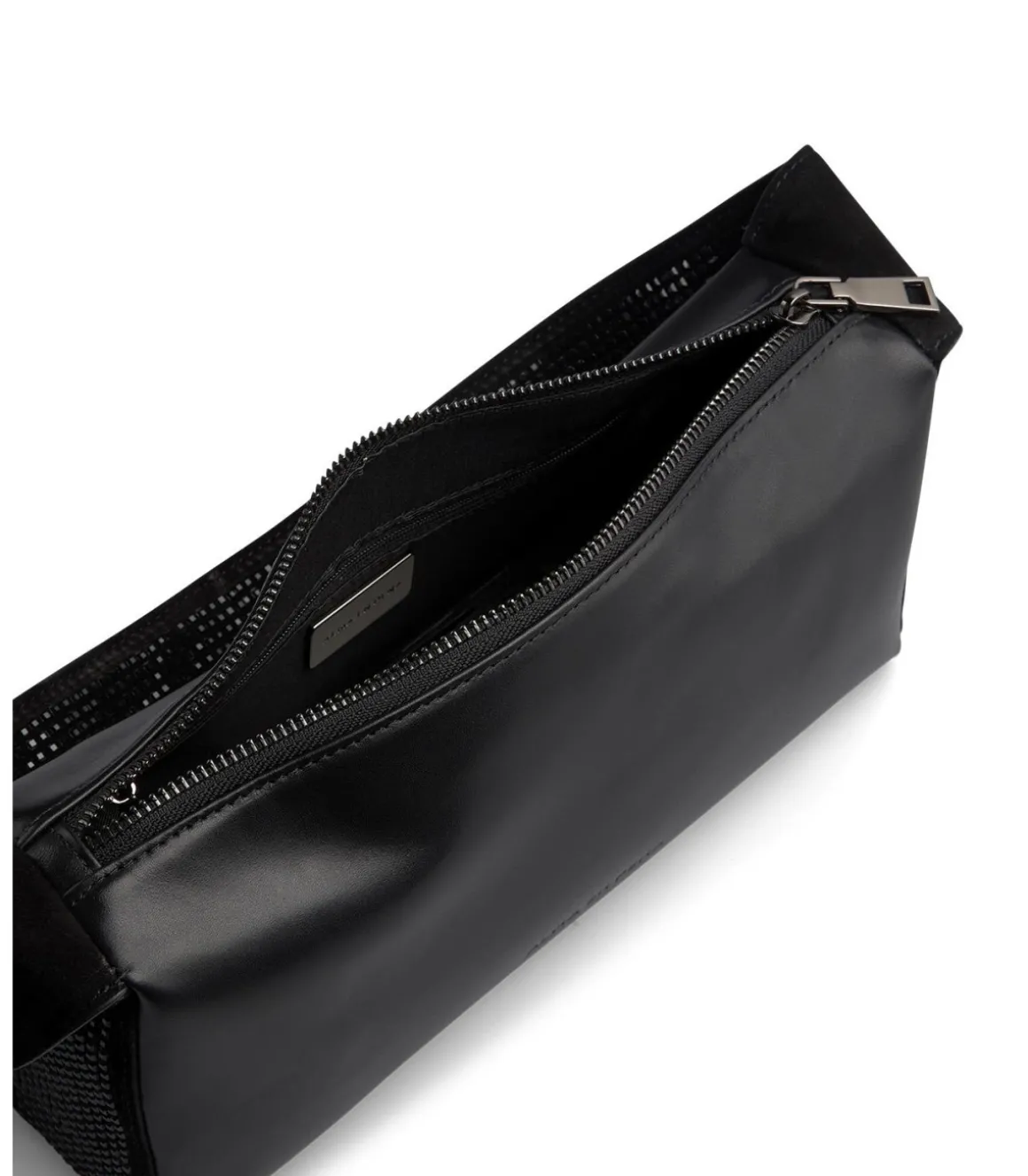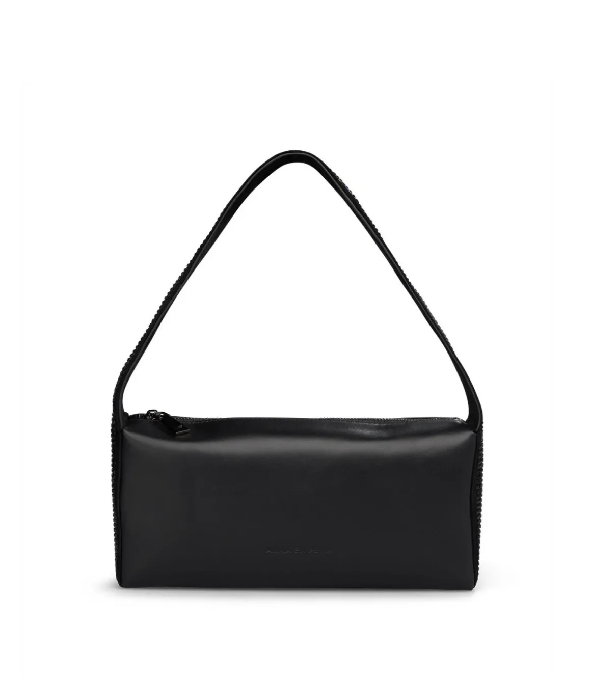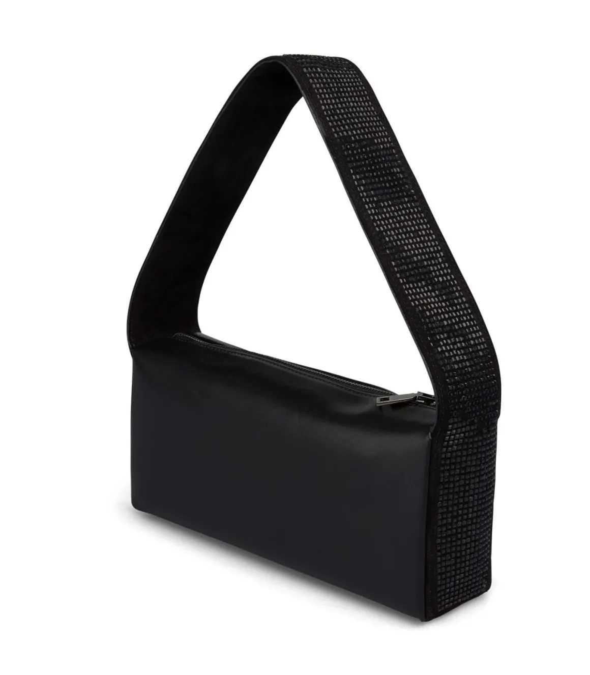 Bolso tipo baguette con asa cubierta con pedrería. Con interior de forro textil. Cierre con cremallera.