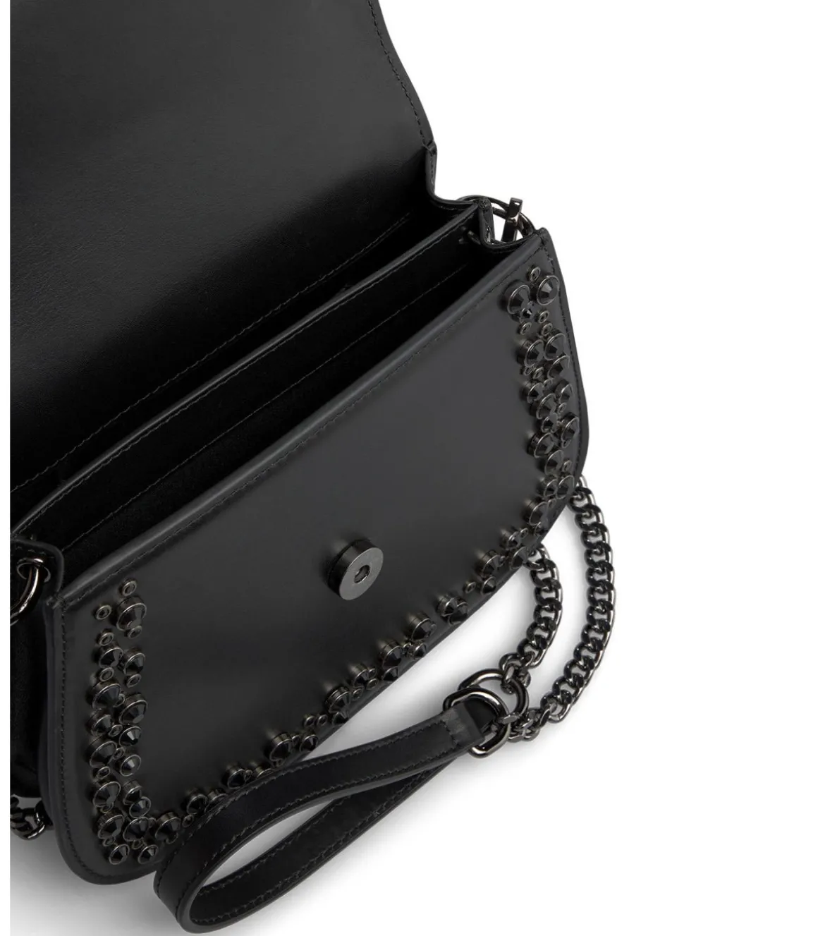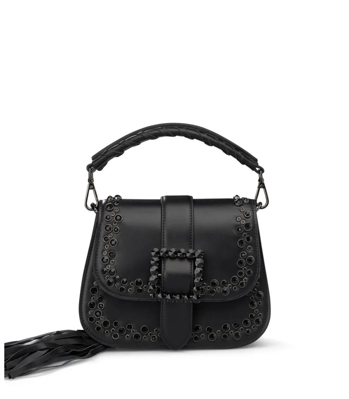 Bolso formato bandolera, detalle cuadrado cubierto con pedrería y tachas de pedrería con flecos colgantes. Asa de mano y asa de cadena metálica larga función bandolera. Realizado en piel con interior de forro textil. Cierre mediante imán con hebilla de joya. Detalle de borla con flecos en la parte inferior.