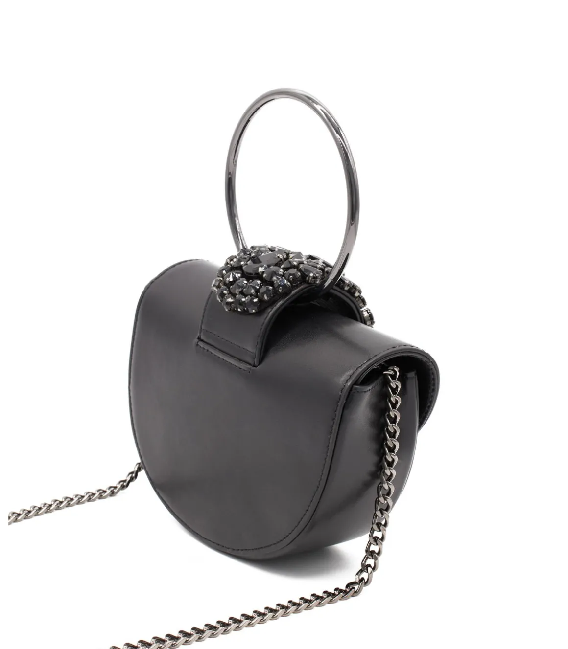 Bolso en forma de media luna. Asa de mano metálica en formato anillo y asa larga de cadena metálica, función bandoler…