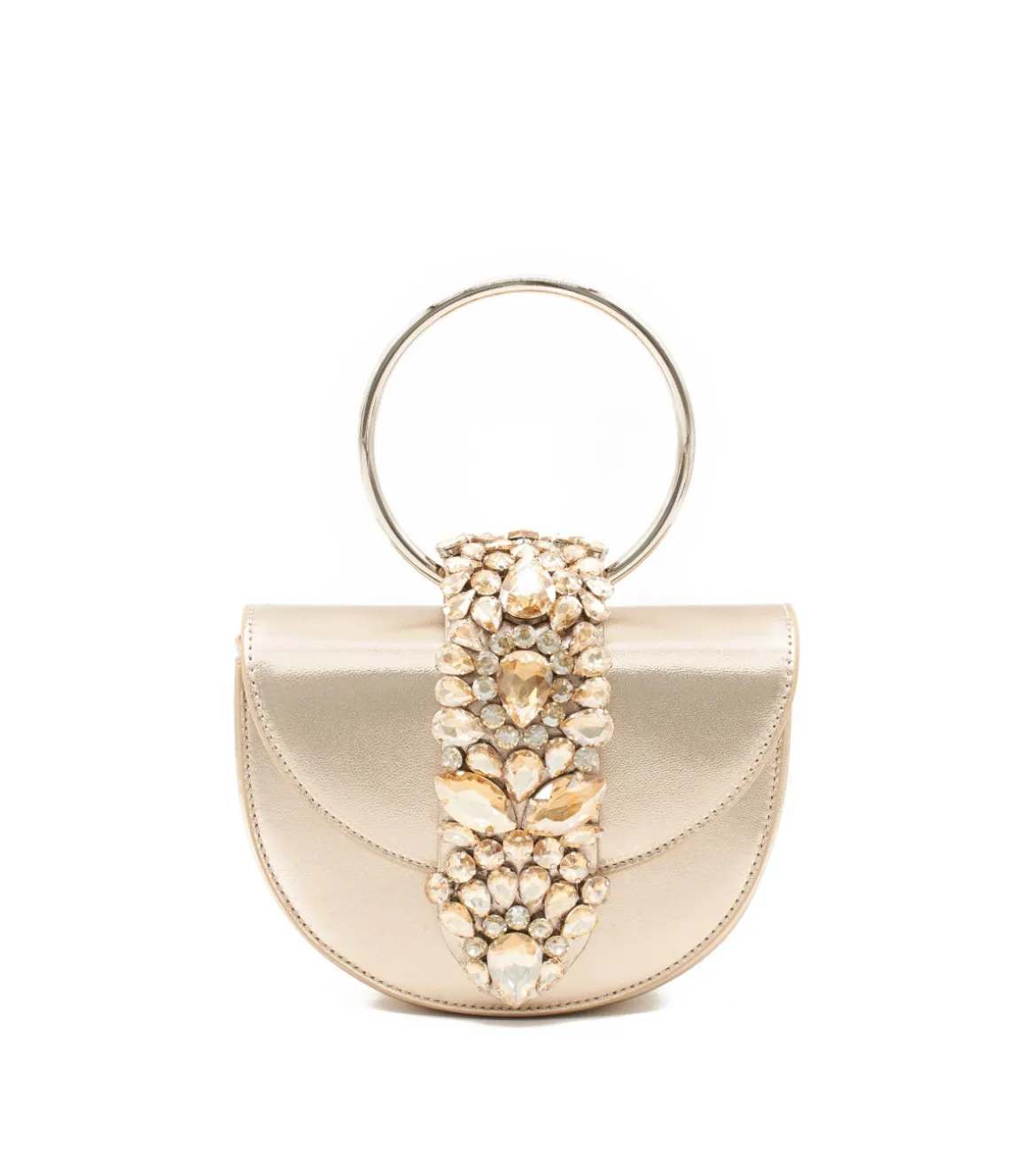 Bolso en forma de media luna. Asa de mano metálica en formato anillo y asa larga de cadena metálica, función bandolera. Interior de forro textil. Cierre mediante imán de joya en la solapa delantera.