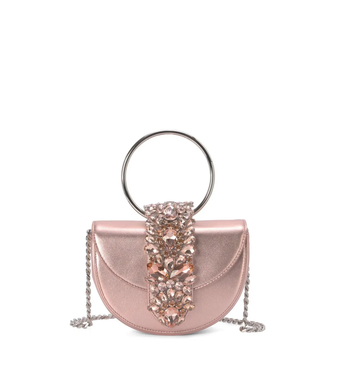 Bolso en forma de media luna. Asa de mano metálica en formato anillo y asa larga de cadena metálica, función bandoler…