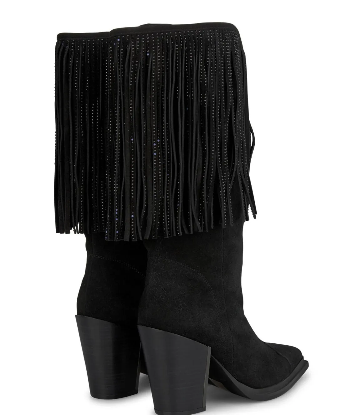 Bota tacón con puntera afilada y caña ancha con flecos colgantes. Sin cierre y con tacón de tipo bloque. La altura del tacón es de 9,5cm y la caña de la bota mide 30cm.