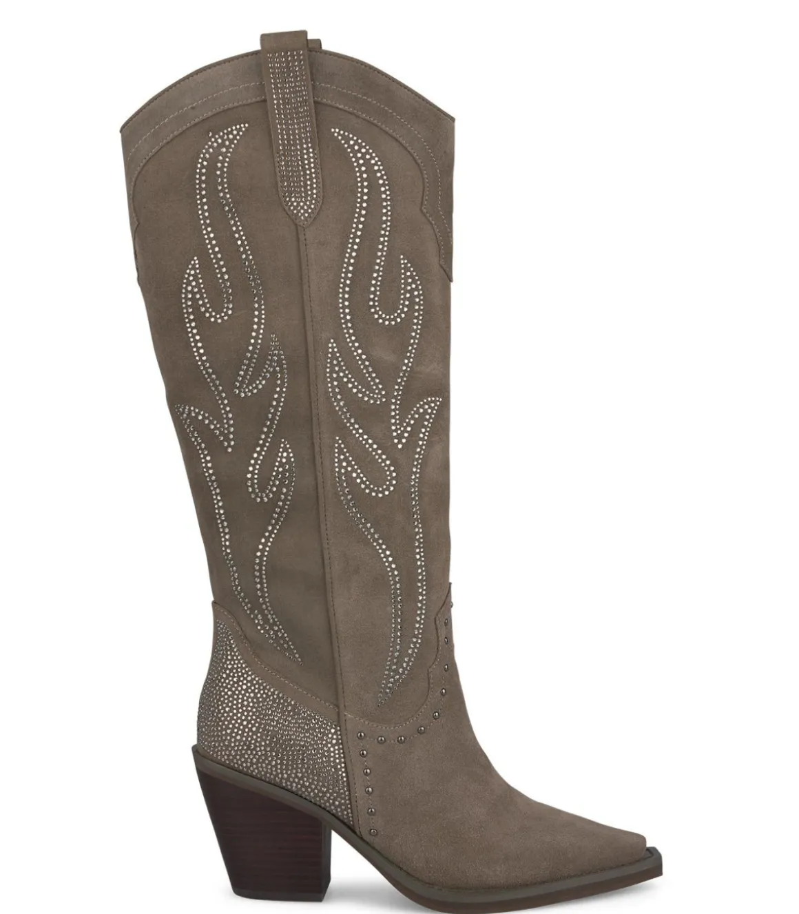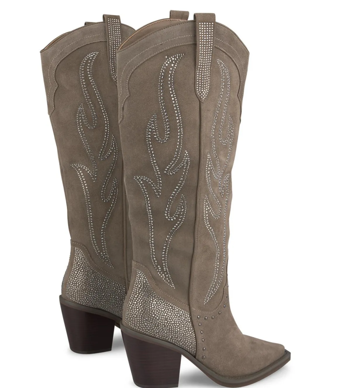 Bota cowboy de mujer realizada en piel con adorno de pedrería. Puntera afilada y tacón bloque. La altura del tacón es de 8,5cm.