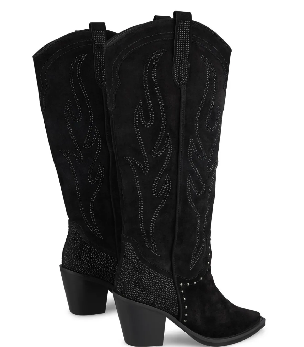 Bota cowboy de mujer realizada en piel con adorno de pedrería. Puntera afilada y tacón bloque. La altura del tacón es de 8,5cm.