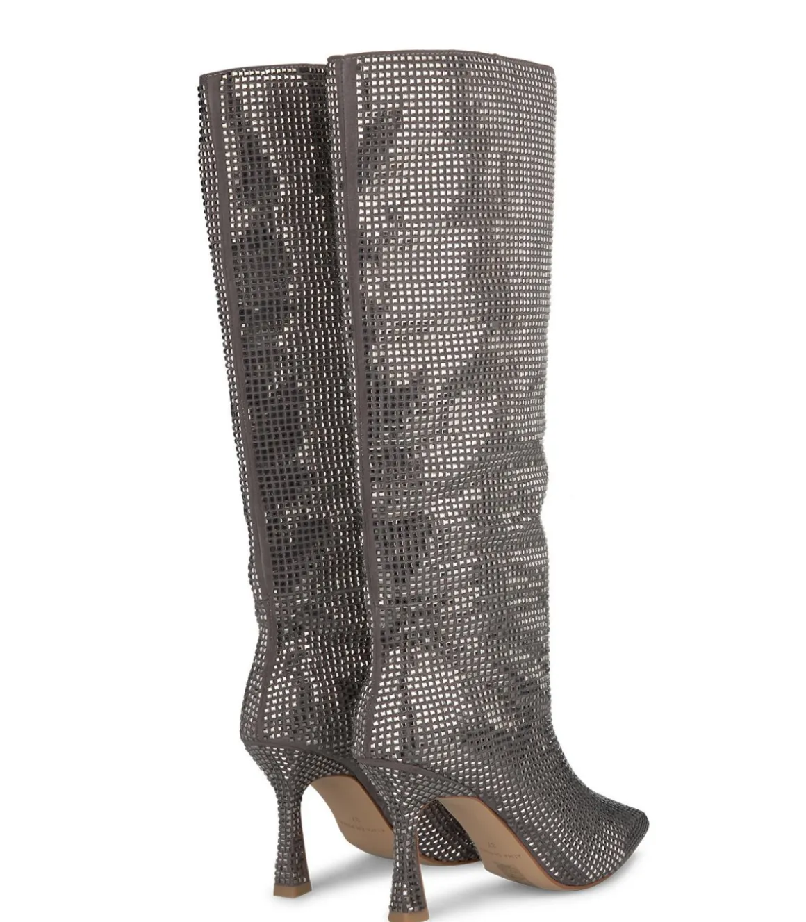 Bota de tacón de aguja para mujer cubierta con pedrería. La puntera es afilada. Y la altura del tacón es de 9,5cm y la caña mide 38cm.