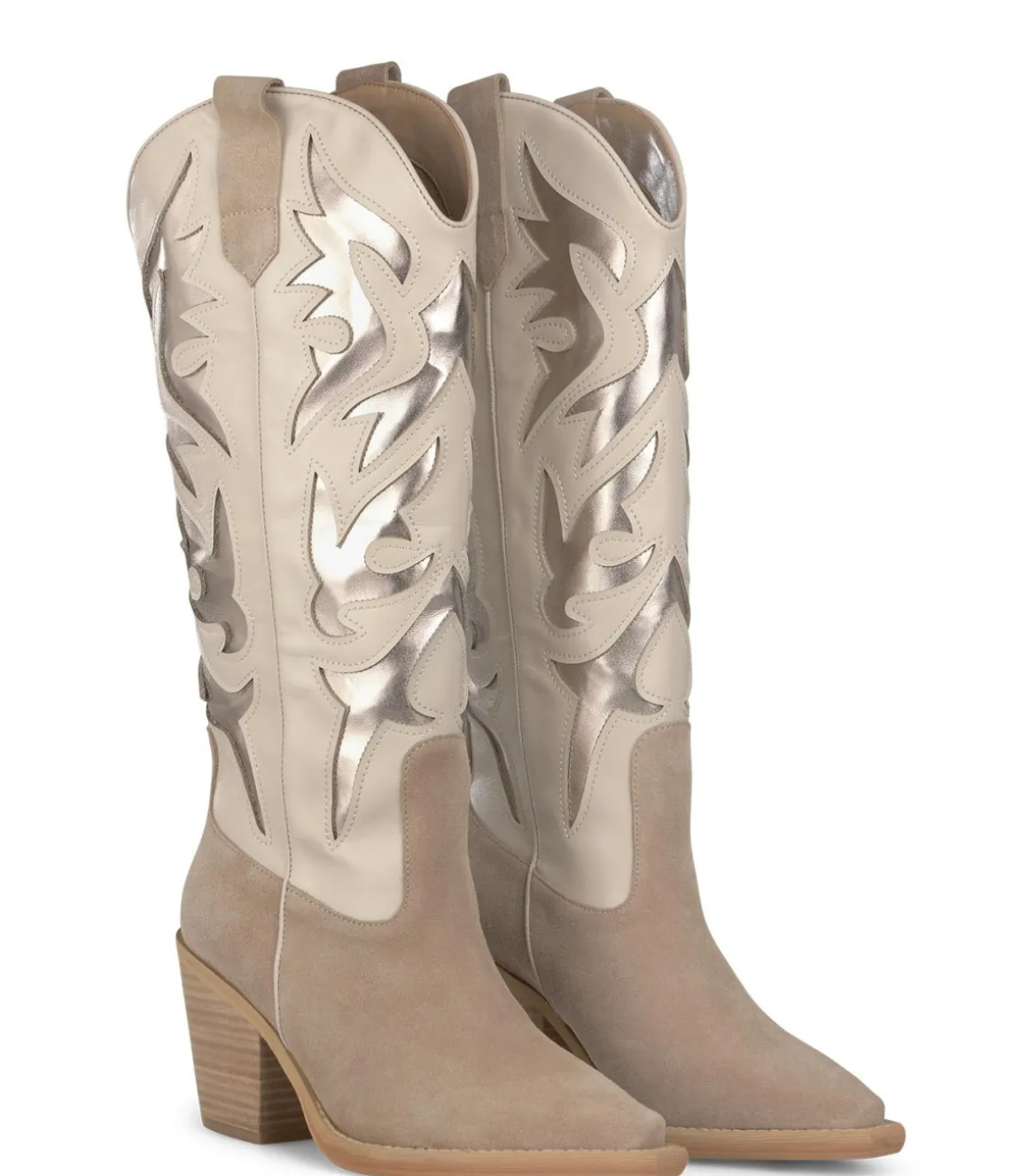 Bota cowboy de tacón de mujer realizada en piel con bordados. La altura de la caña es de 34cm. La altura del tacón es de 7cm.