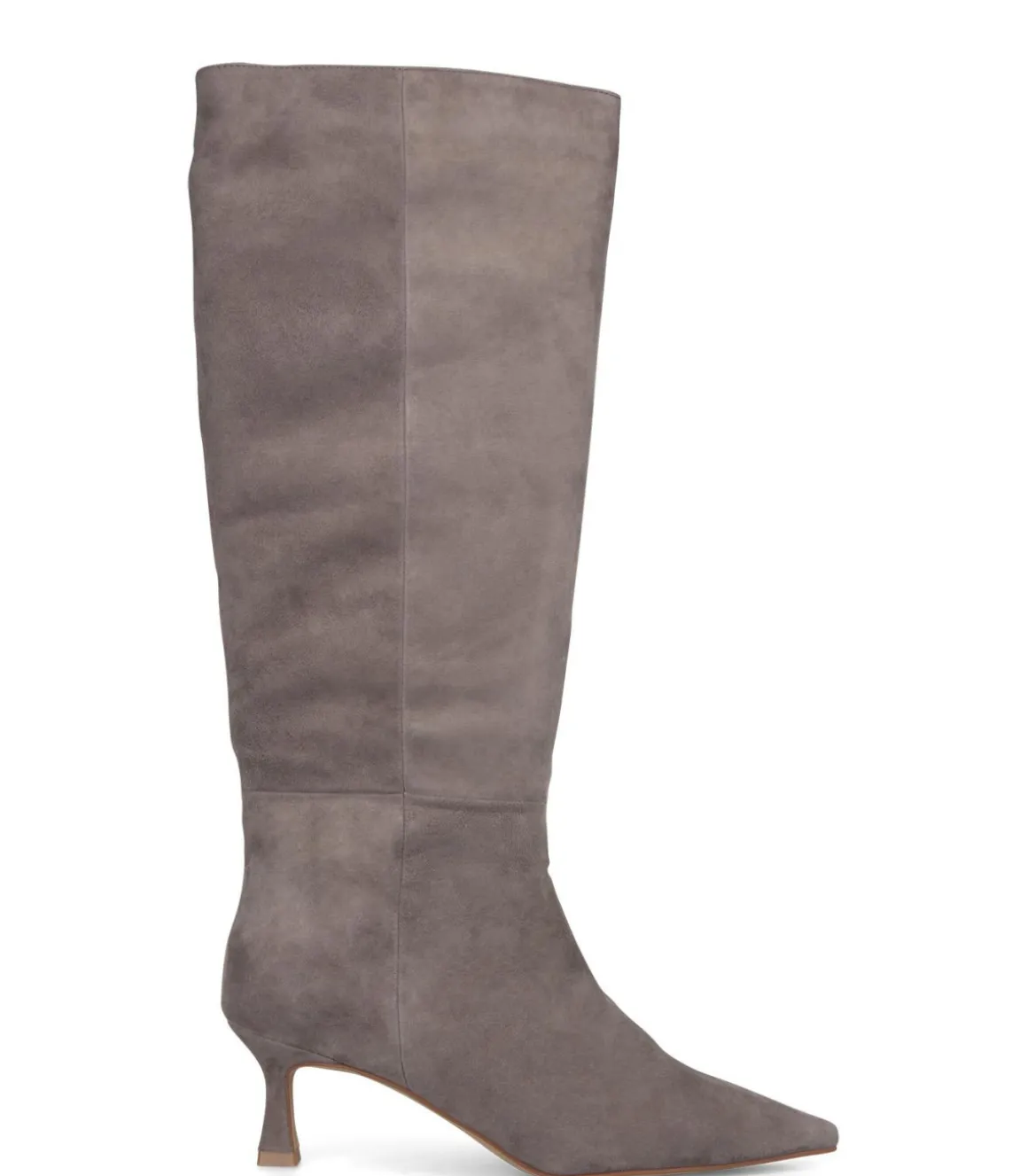 Bota de tacón de aguja mini para mujer. La puntera es afilada. Y la altura del tacón es de 7cm y la caña mide 42cm.