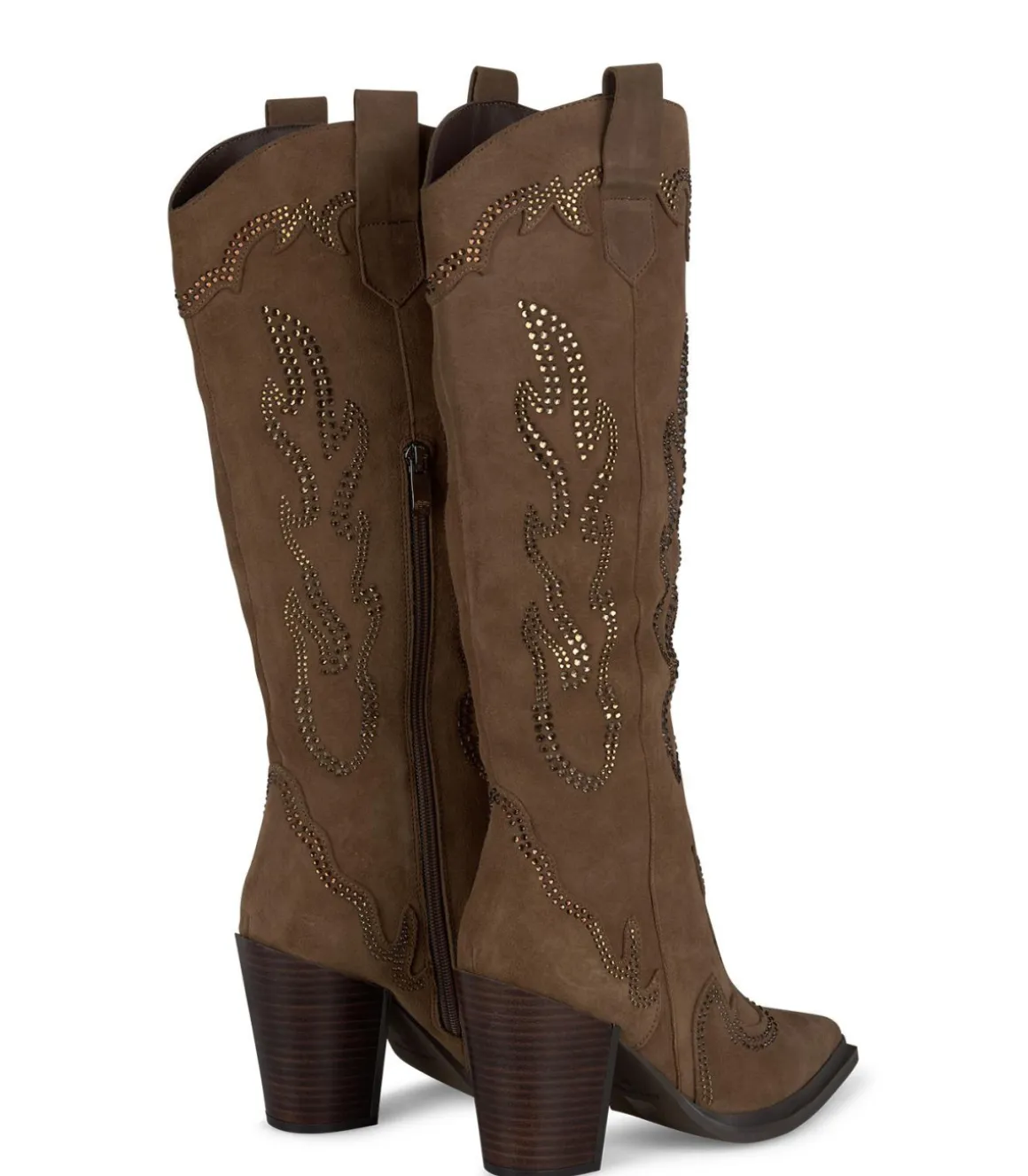 Bota cowboy con tacón de mujer con brillos. Puntera afilada y tacón de tipo bloque, confeccionado en piel. La altura del tacón es de 9,5cm y la caña del botín mide 39cm.