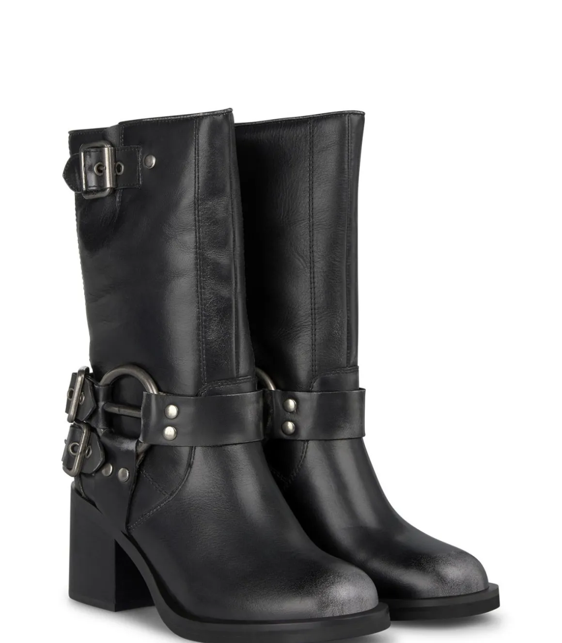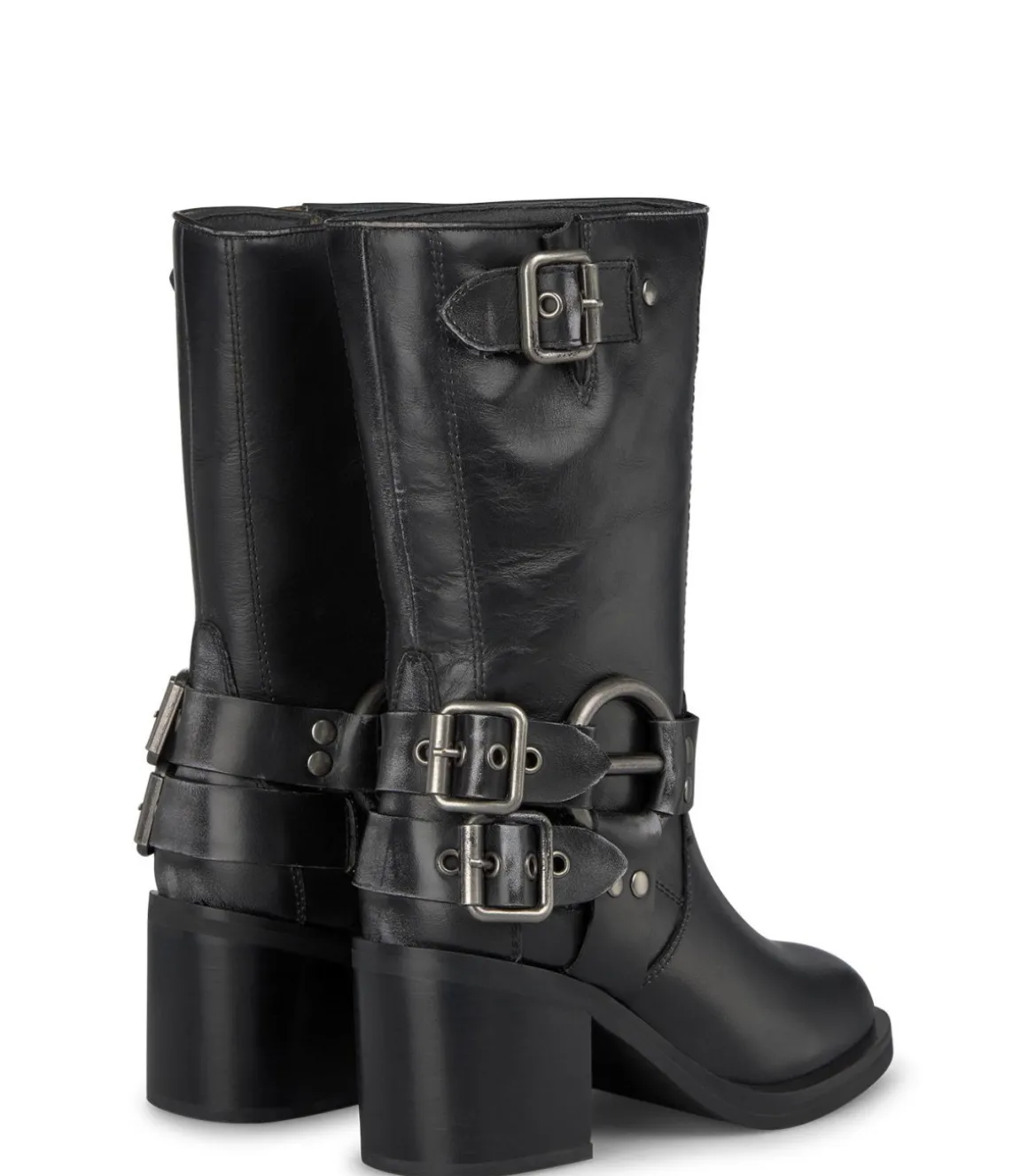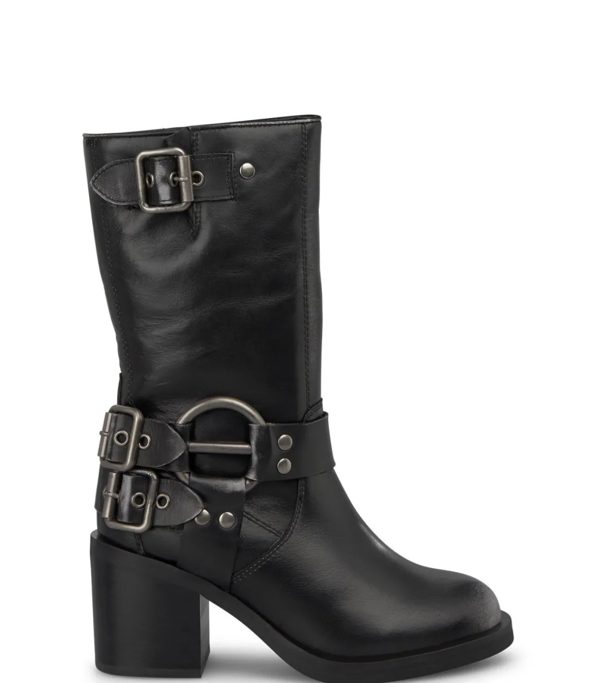 Media bota tacón de mujer con tachas en las hebillas y detalle circular metalizado. Con puntera redondeada, confecciona…